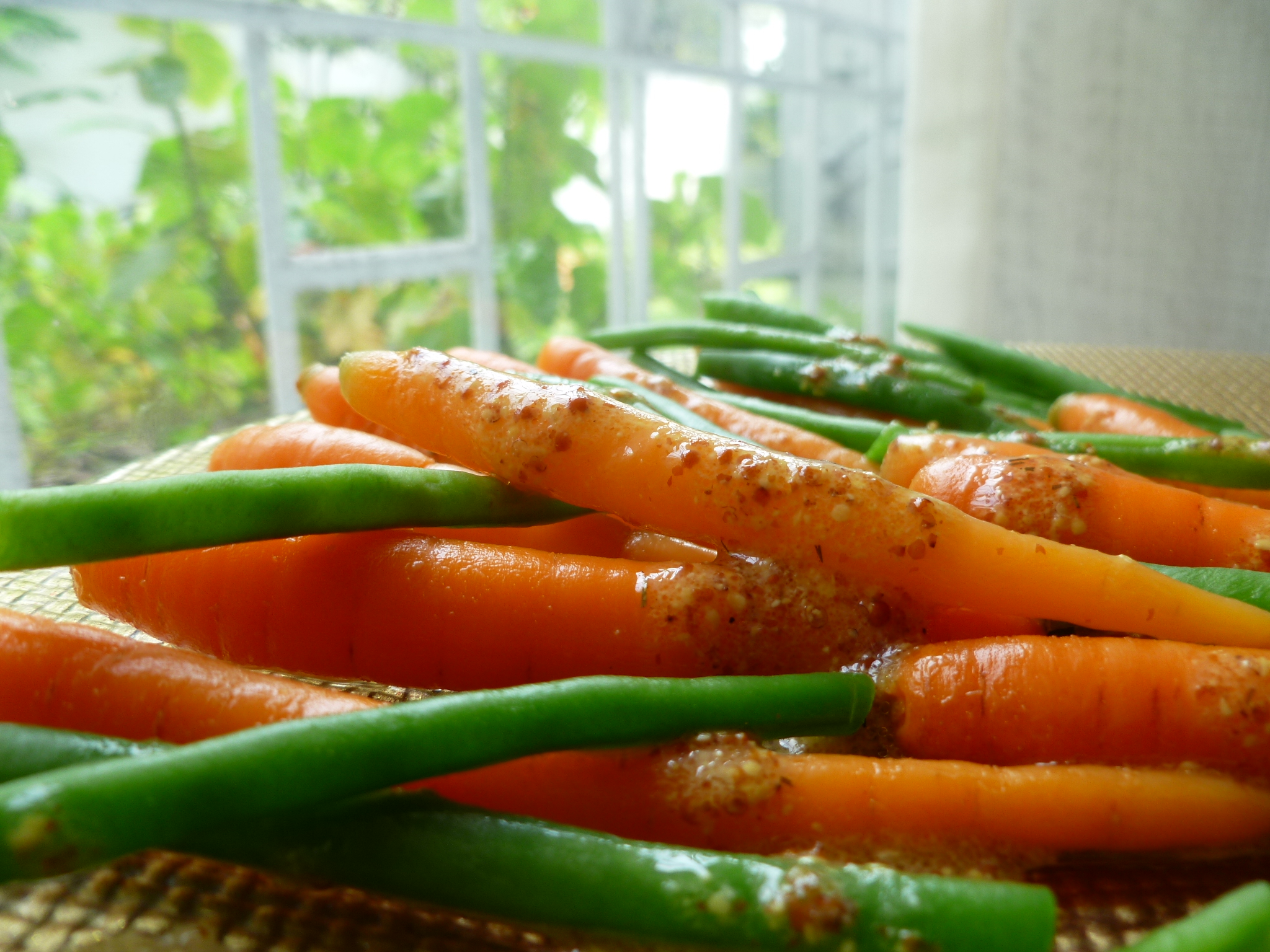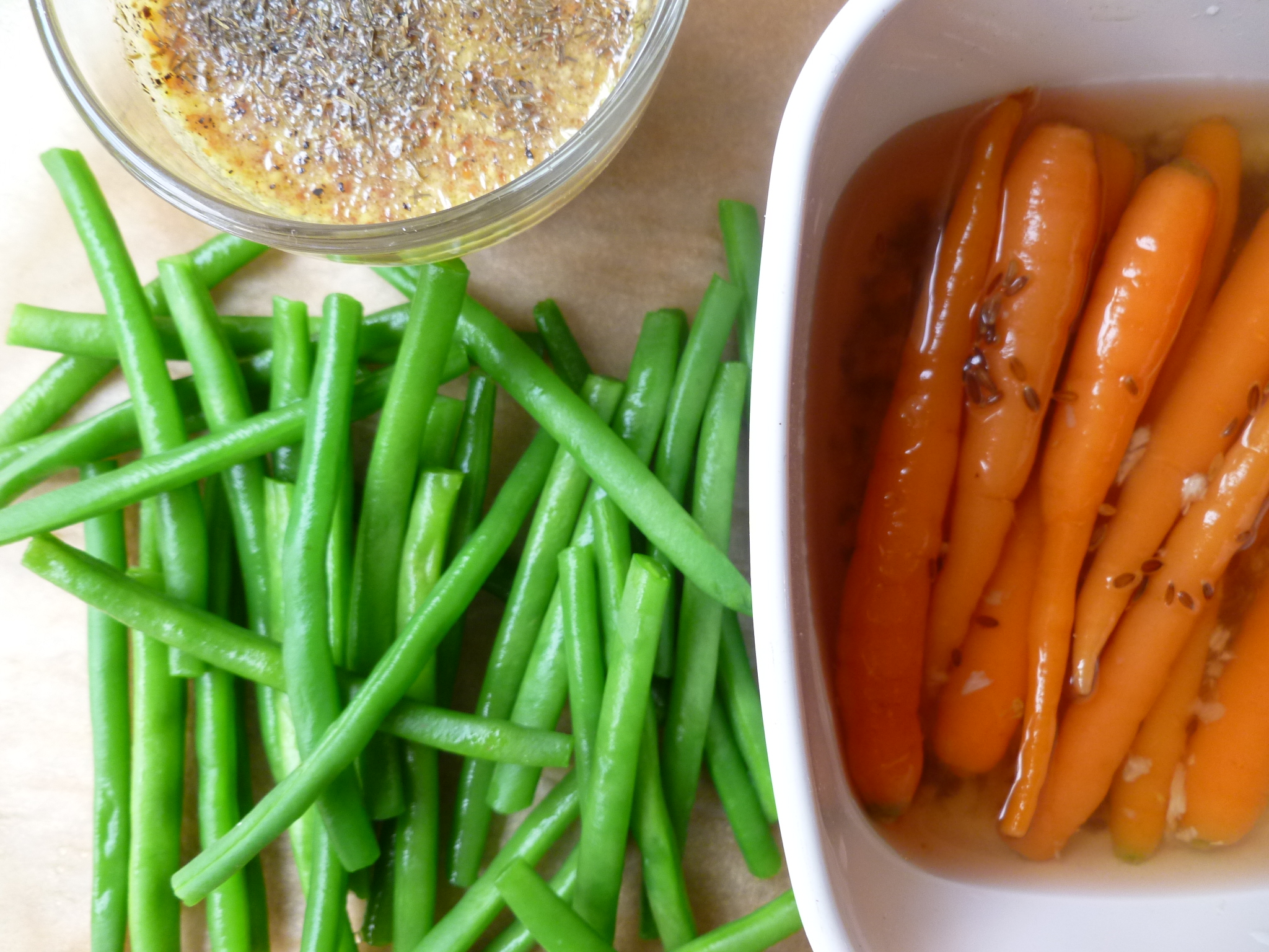 baby carrots, Dijon mustard vinaigrette, French green beans, haricots verts, how to keep green beans green, marinade for vegetables