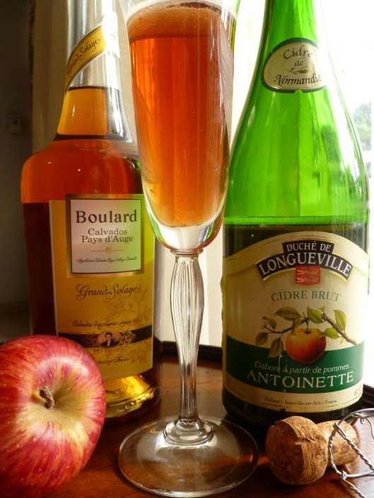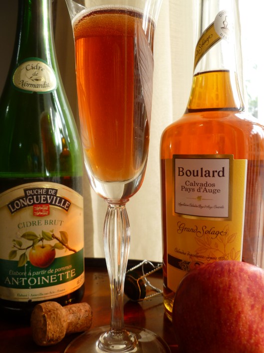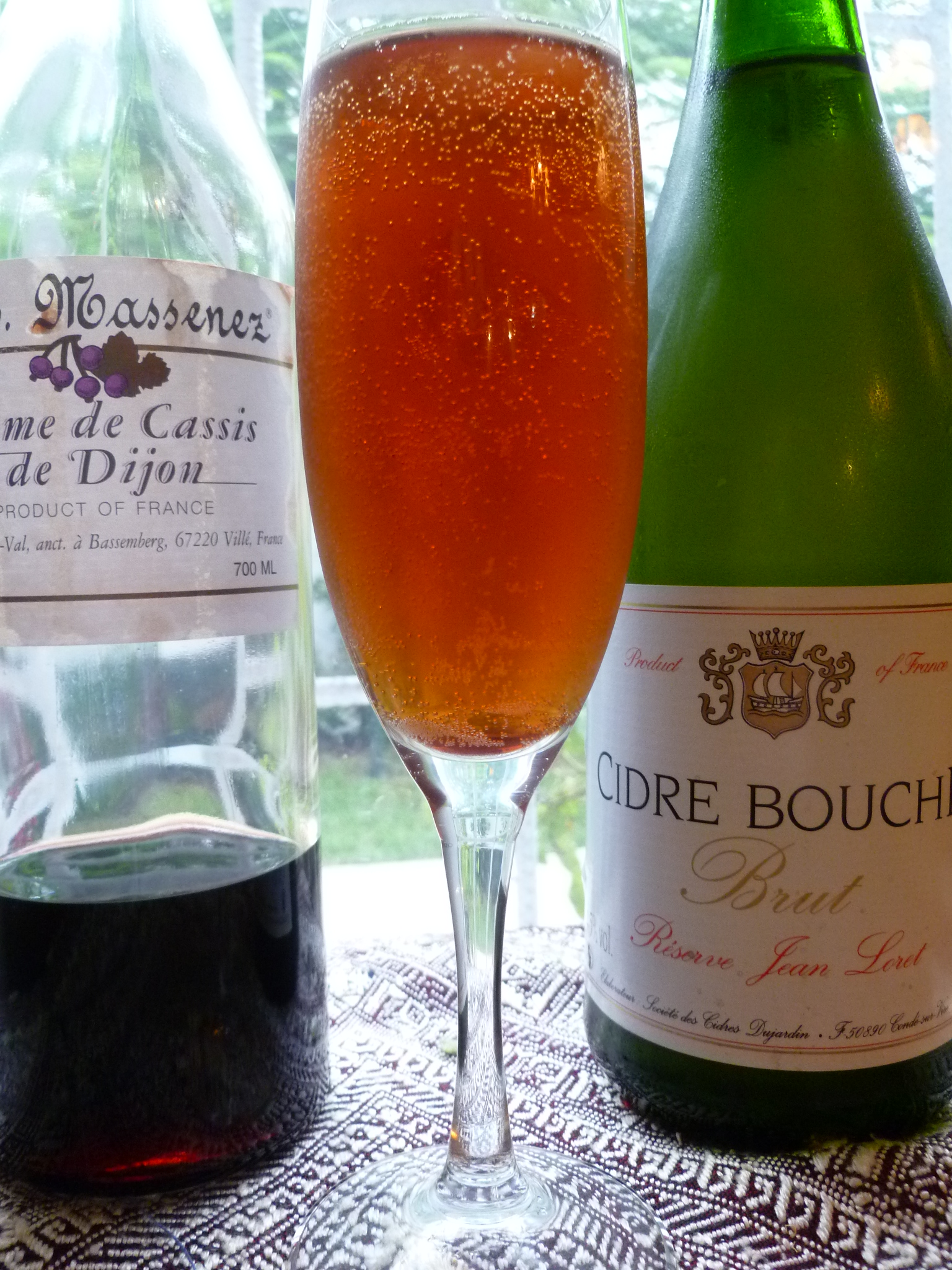 There are a number of variations on a basic Kir. Kir Royale substitutes Champagne for white wine. (The diplomatickitchen’s versions of Kir and Kir Royal are here, at the end of the recipe for Individual Mushroom Souffles.) A Kir Breton–or Normande–replaces the wine with sparkling hard cider. Whether the Kir is ‘Breton’ or ‘Normande’ depends on whether the cider comes from Brittany or Normandy. Both versions are bottled like Champagne and are sparkling pleasures–lovely to look at as well as to drink.