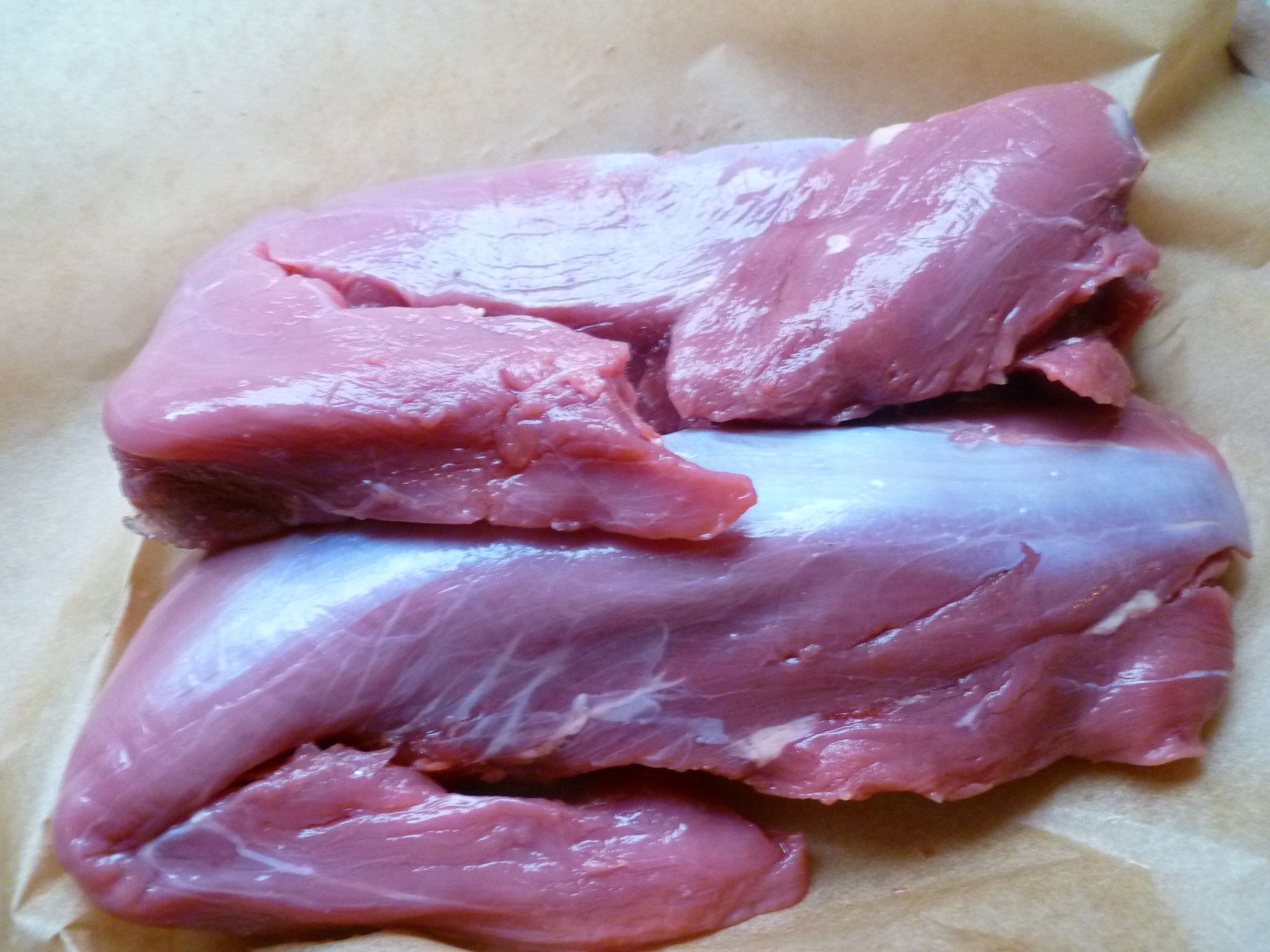 - 2 pounds of veal filet or thin-slices of veal cutlet from the center of the leg: or substitute the same amount of pork filet or tenderloin, sliced thinly: the photographed meat is veal filet