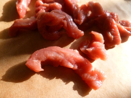 1. To prepare the meat: Whether you use veal or pork, filet, tenderloin, or cutlets–and if the butcher as not already cut the meat for you– placing the meat in the freezer for 30 minutes or so will make it easier to sliceit thinly. If you are on good terms with an excellebnt butcher, ask him to do the slicing and ribbon-ing for you. Otherwise, after firming the meat up in the freezer, remove the the white strip of connective tissue (the silver skin) that runs down the length of the filet. Cut the filet into thin slices and cut the slices into narrow ribbons…