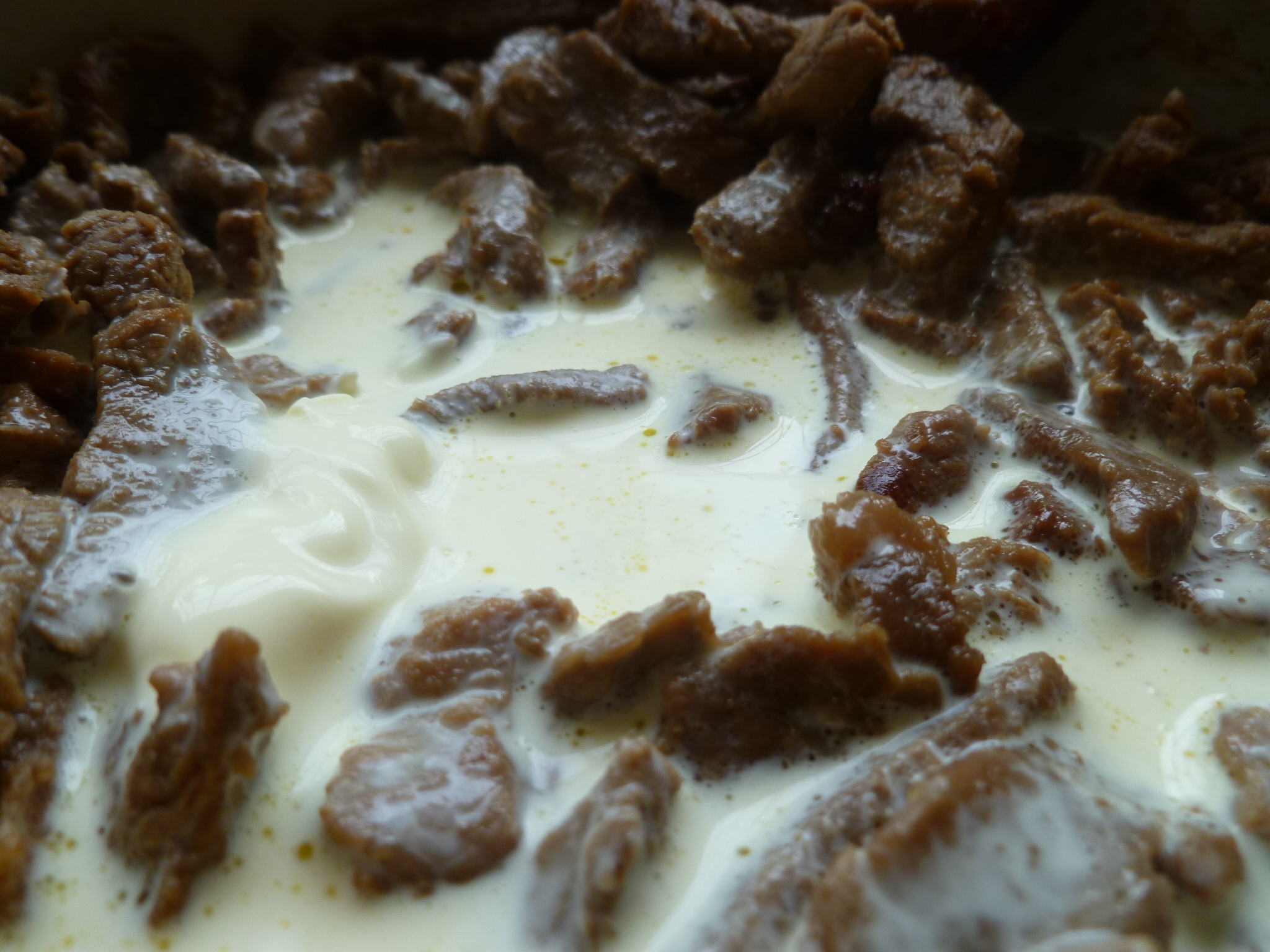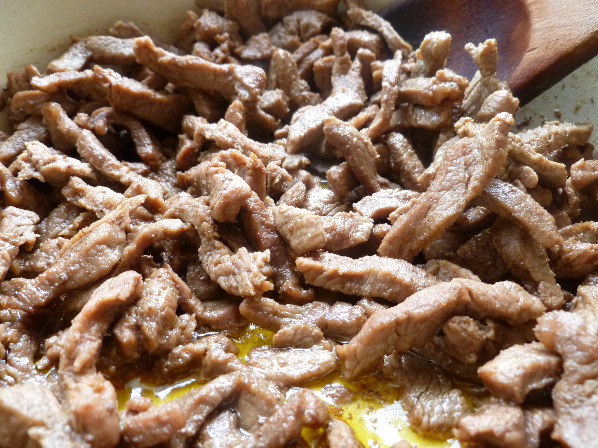 3. Heat the butter slowly until it foams and add the strips of meat. Cook them over medium low heat, stirring frequently, until all the butter is absorbed. The butter will puddle and sizzle; the meat will change colour as it slowly cooks, but shouldn’t crisp as it does when fried.