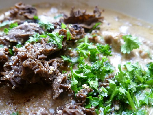 … and bring it to a simmer. Cook the Geschnetzeltes gently until the cream reduces and starts to thicken and look like a sauce. Add the demi-glace, parsley and morels…and several grinds of black pepper and salt: