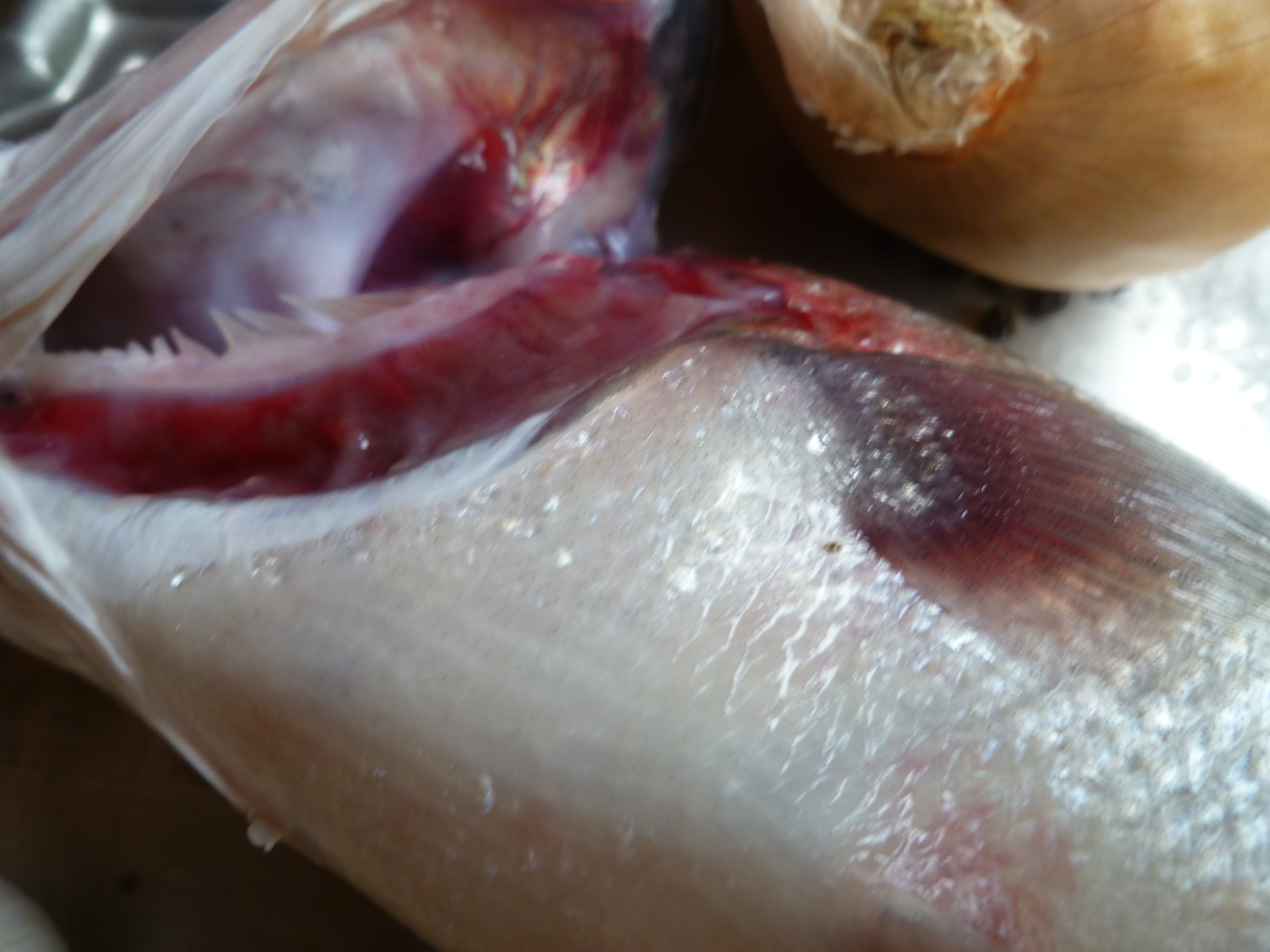 3. Cut a few diagonal gashes down to the bone along the sides of the fish and rub the marinade all over them…