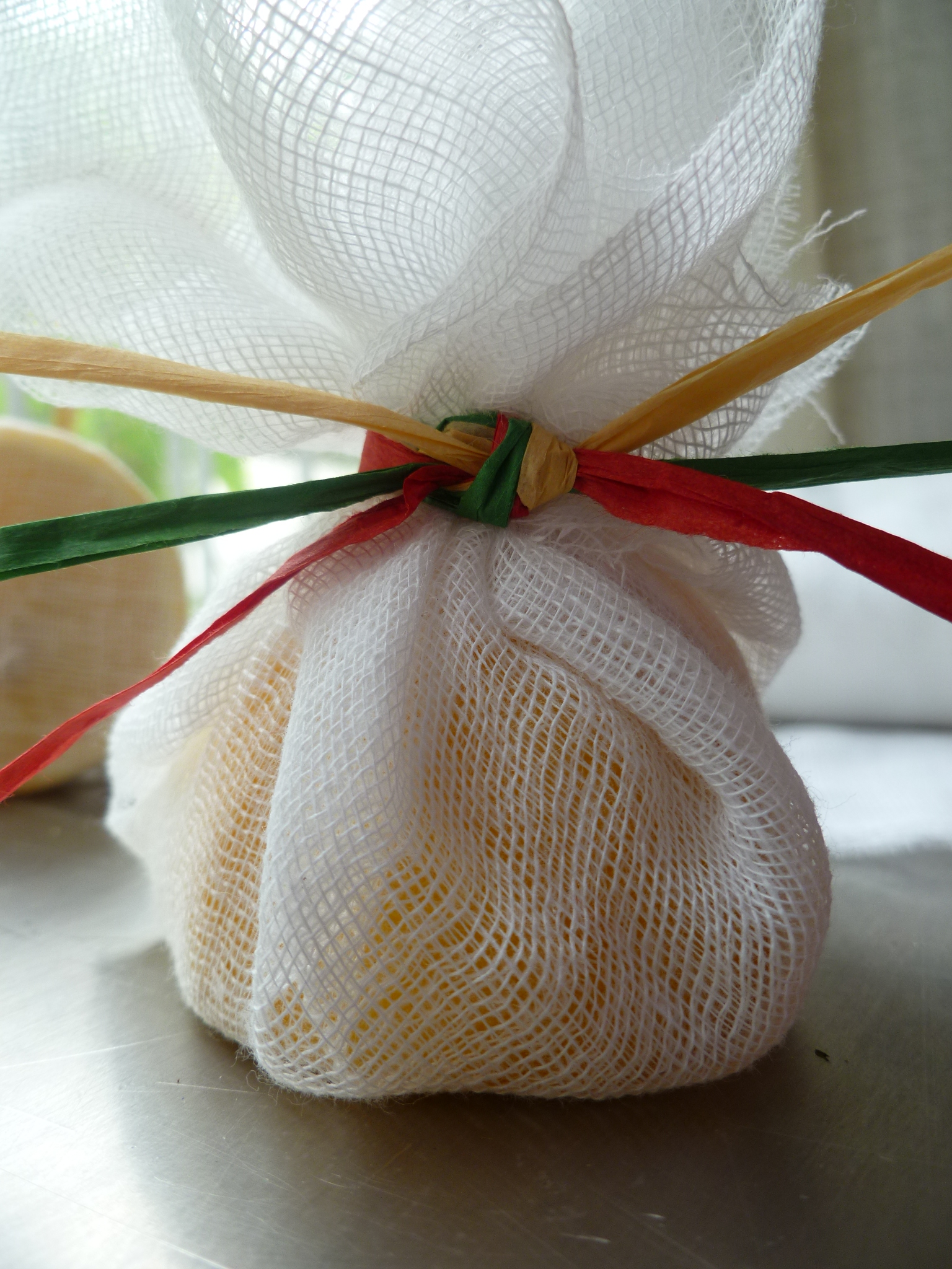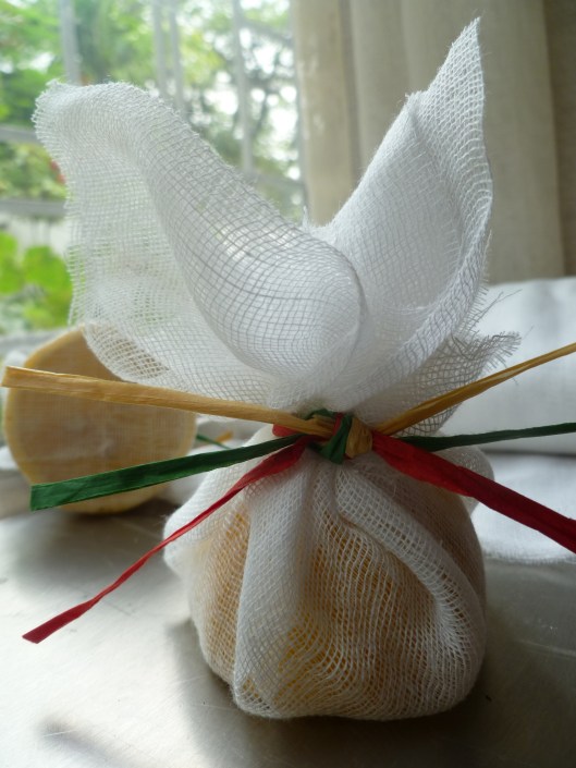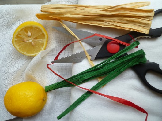 3. Gather up the ends of the cloth and tie several strands of raffia around them to bundle up the lemon in the cloth:
