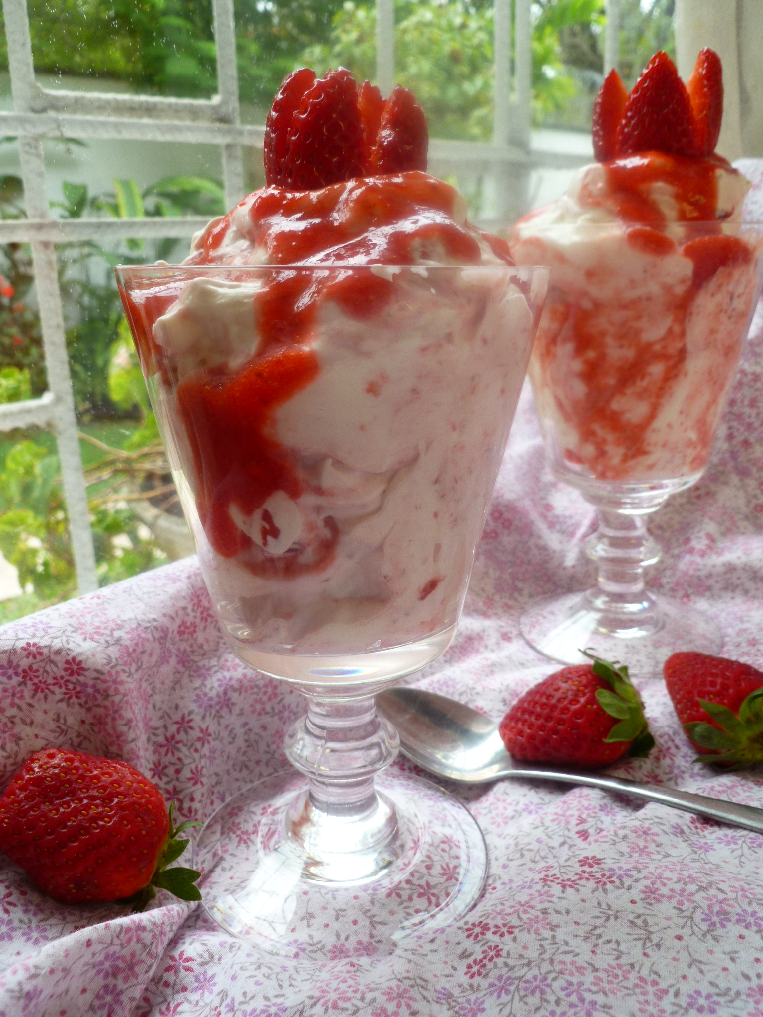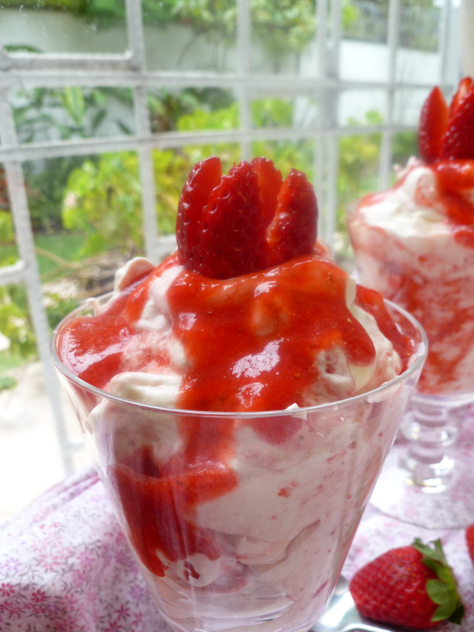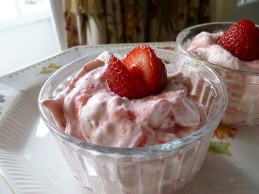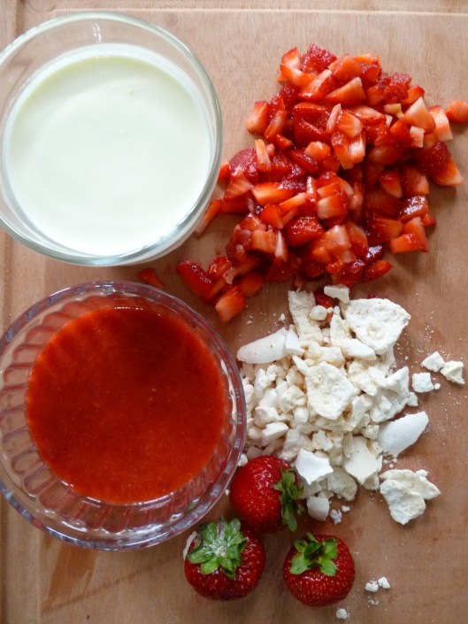 A Note about serving the Eton Mess: the strawberries may be cut and pureed in advance, and the cream whipped and everything mixed together right before it’s time to eat the dessert.