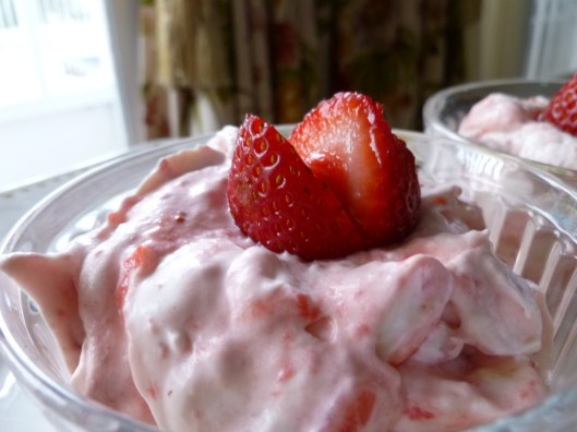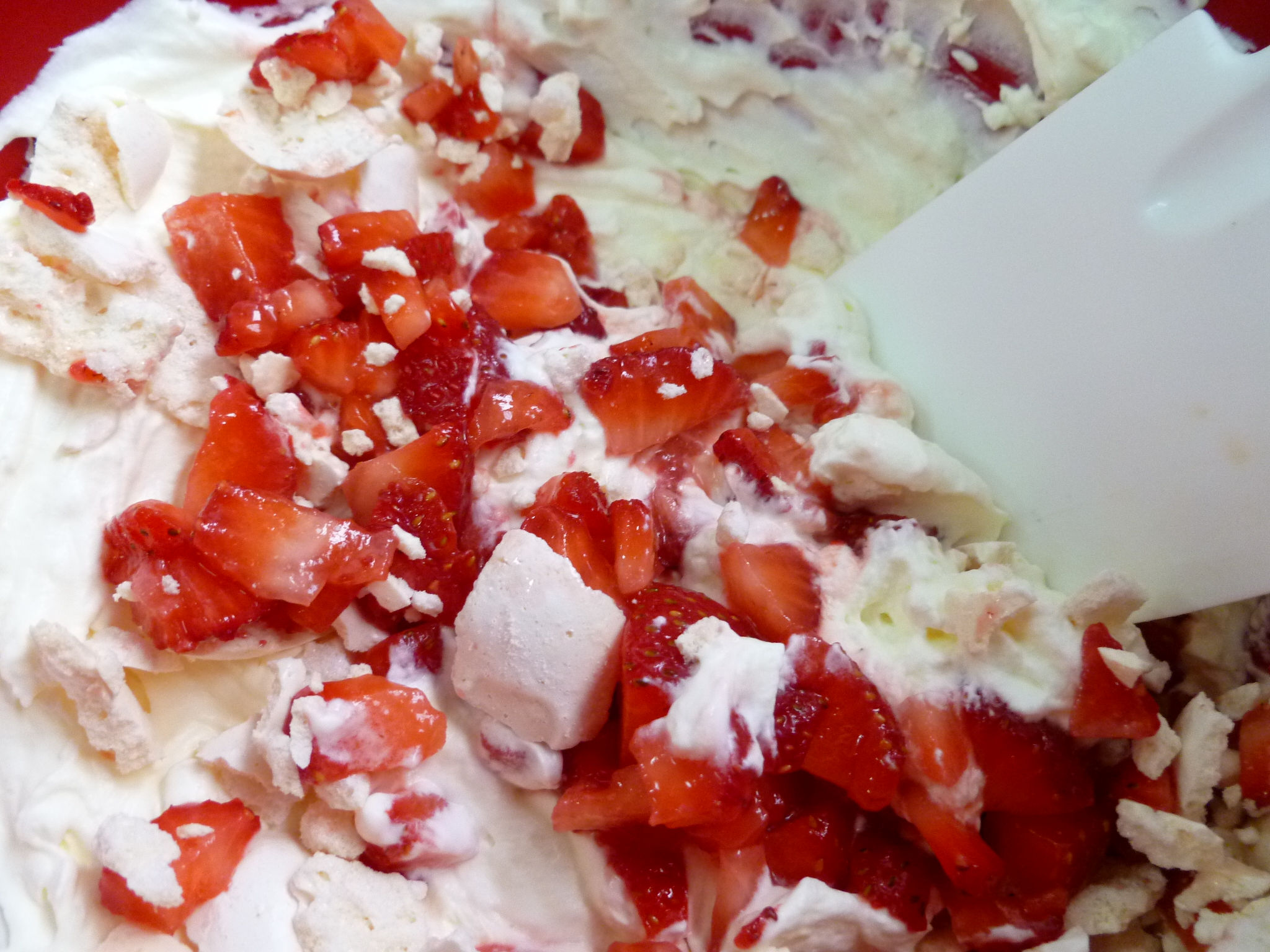 5. Add the crumbled meringues and the chopped berries with their juice to the whipped cream and fold them around in the cream–in a desultory fashion. Do the same with all but 4 Tablespoons of the strawberry purée. The dessert should be streaky with fruit and cream…not homogeneous: