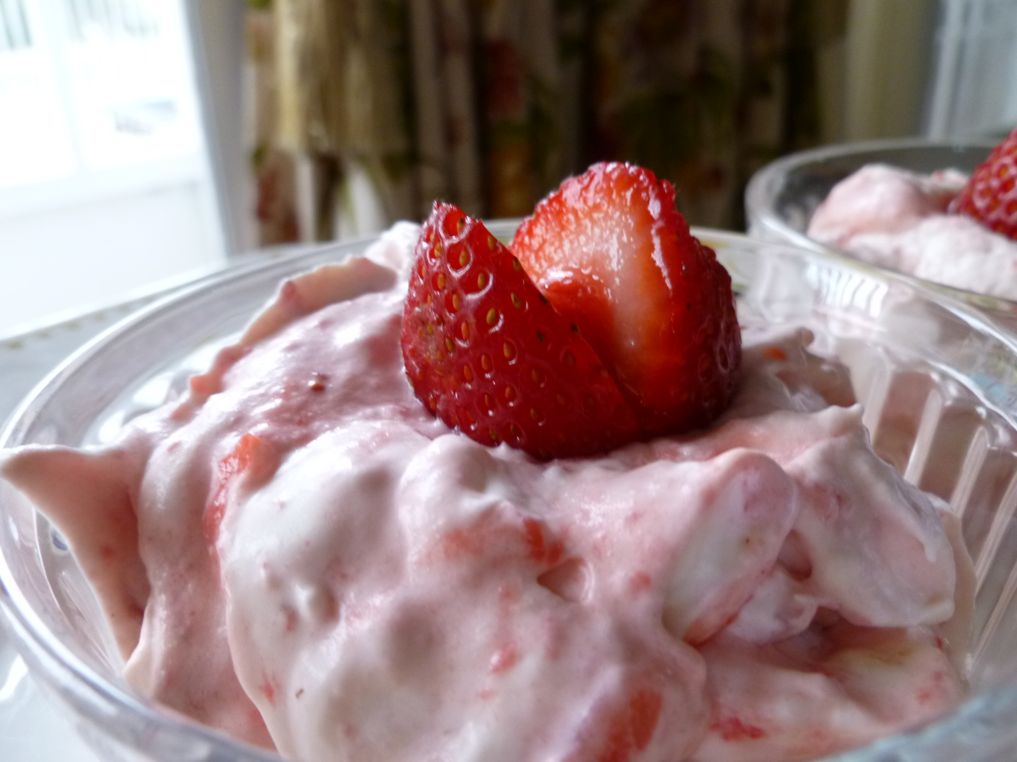 4. When it is time for dessert, whip the cream until it forms floppy waves and peaks that don’t move around the bowl easily but, at the same time, aren’t stiff. Whip a little more and add 2 Tablespoons of sugar. 2 Tablespoons of sugar will result in a lightly sweetened cream–add a little more for a sweeter one.