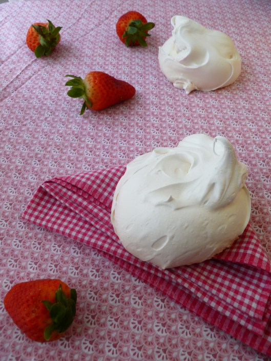 A first Note about making meringues: A dry meringue is the result of the evaporation of the moisture in the foamy egg whites as they bake. If the outside of the meringues hardens too quickly, some moisture is trapped inside, the sugar in the mixture dissolves, and a sticky trickle of syrup “weeps’ from the meringue. The center of the meringue may not harden and dry completely. If this happens on occasion, because of a hot oven or a humid day, never mind. It is the work of a moment to take out the sticky part of the meringue, leaving plenty to crush up into an Eton Mess.