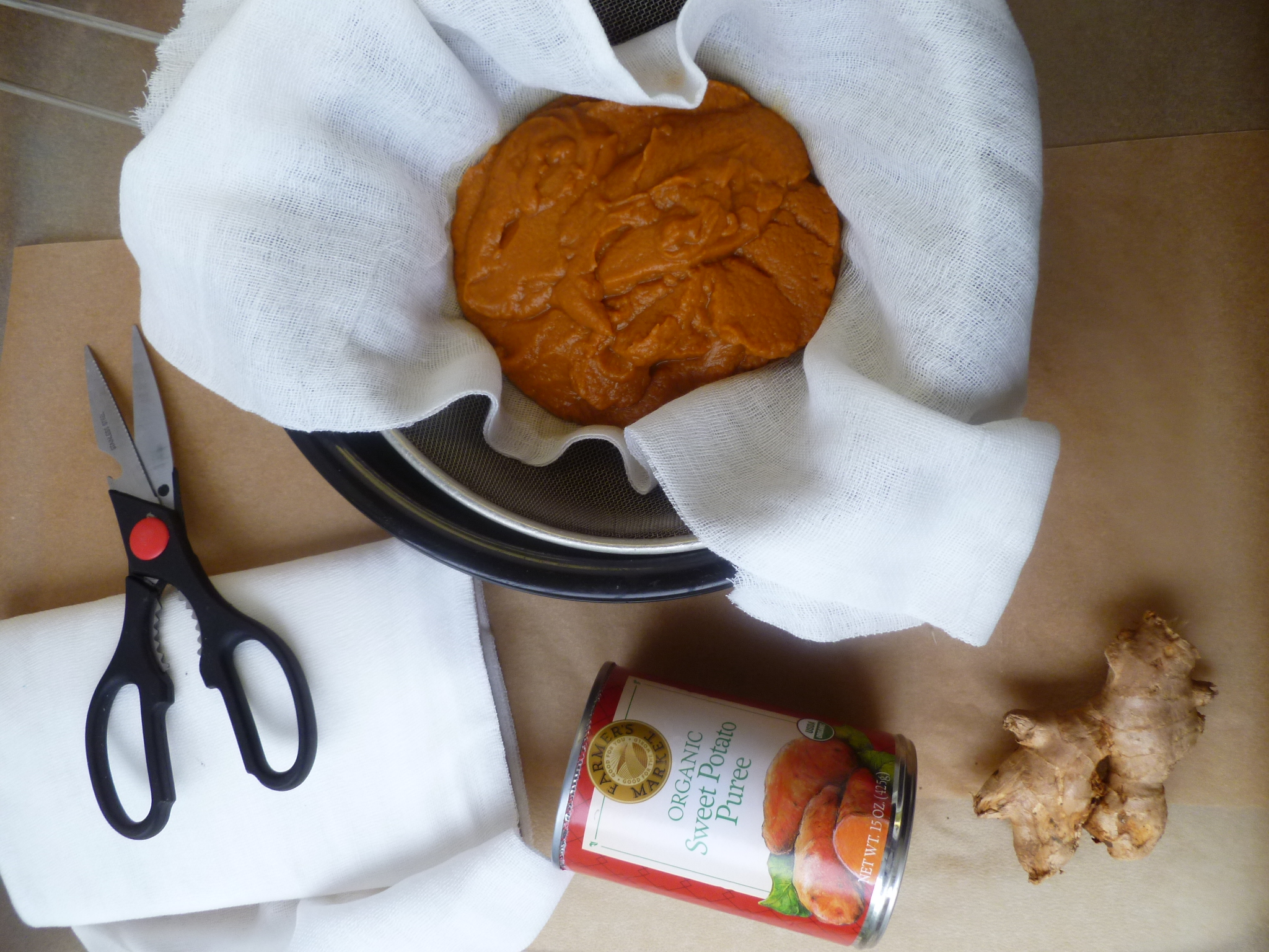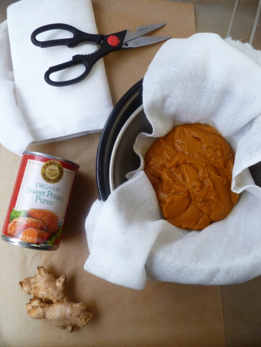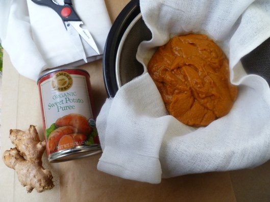 - or 2 15-ounce sized cans of Sweet Potato Purée, drained for 1 hour in a sieve lined with Cheesecloth. Canned Sweet Potato Purée is not as dry as the roasted flesh of fresh Sweet Potatoes, but it is very good if fresh orange potatoes aren’t available.