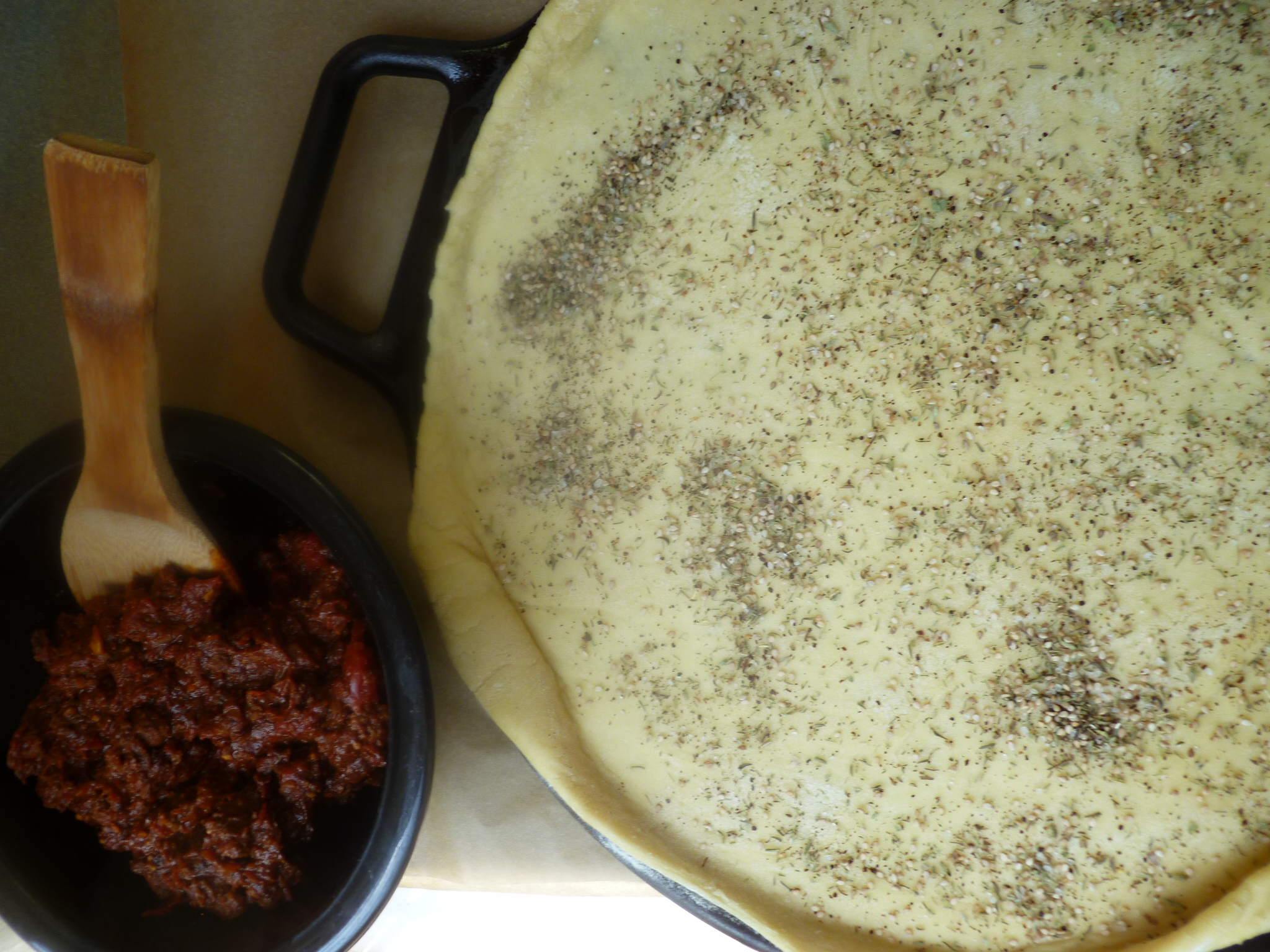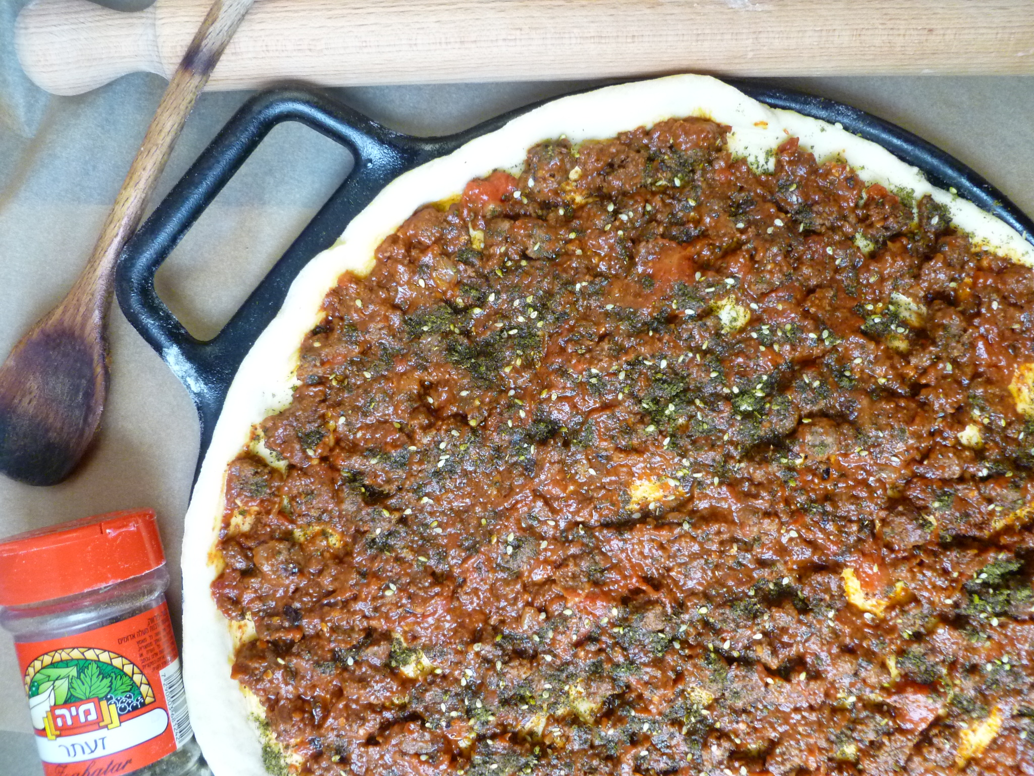 3. Spread the meat topping over the flatbread. Sprinkle the topping with the rest of the Za’atar…(2 and1/2 teaspoons if using prepared Za’atar):