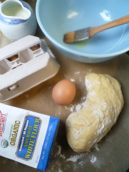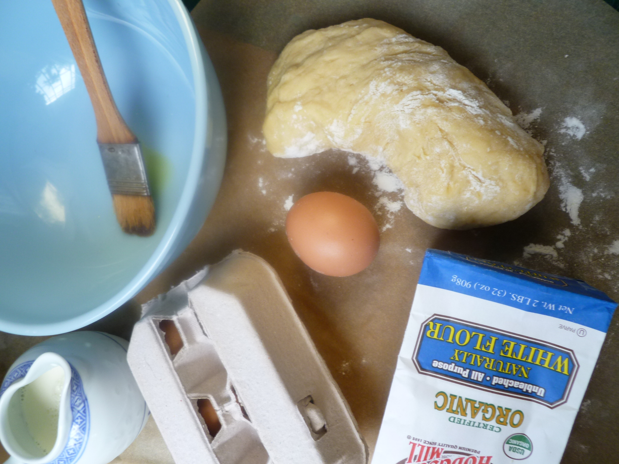 1. In a large bowl, mix the yeast and warm milk together, with the pinch of sugar. When the mixture is foamy, add the flour, salt, beaten egg and olive oil.