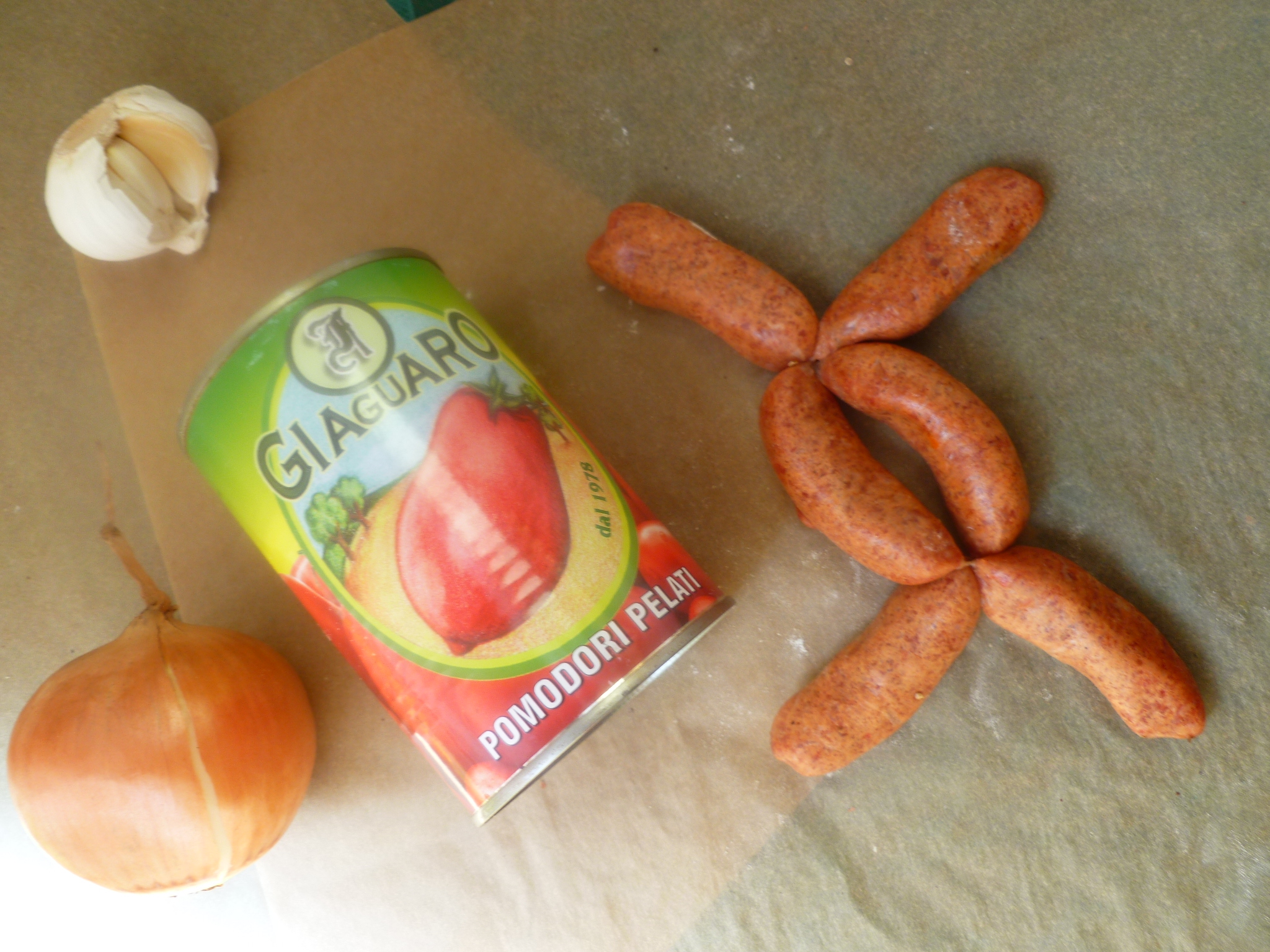 2. Heat the olive oil in the pan and sauté the onion over medium heat until it begins to turn golden. Add the garlic and sauté it for a minute, stirring. Add the ground Merguez sausage and brown it.