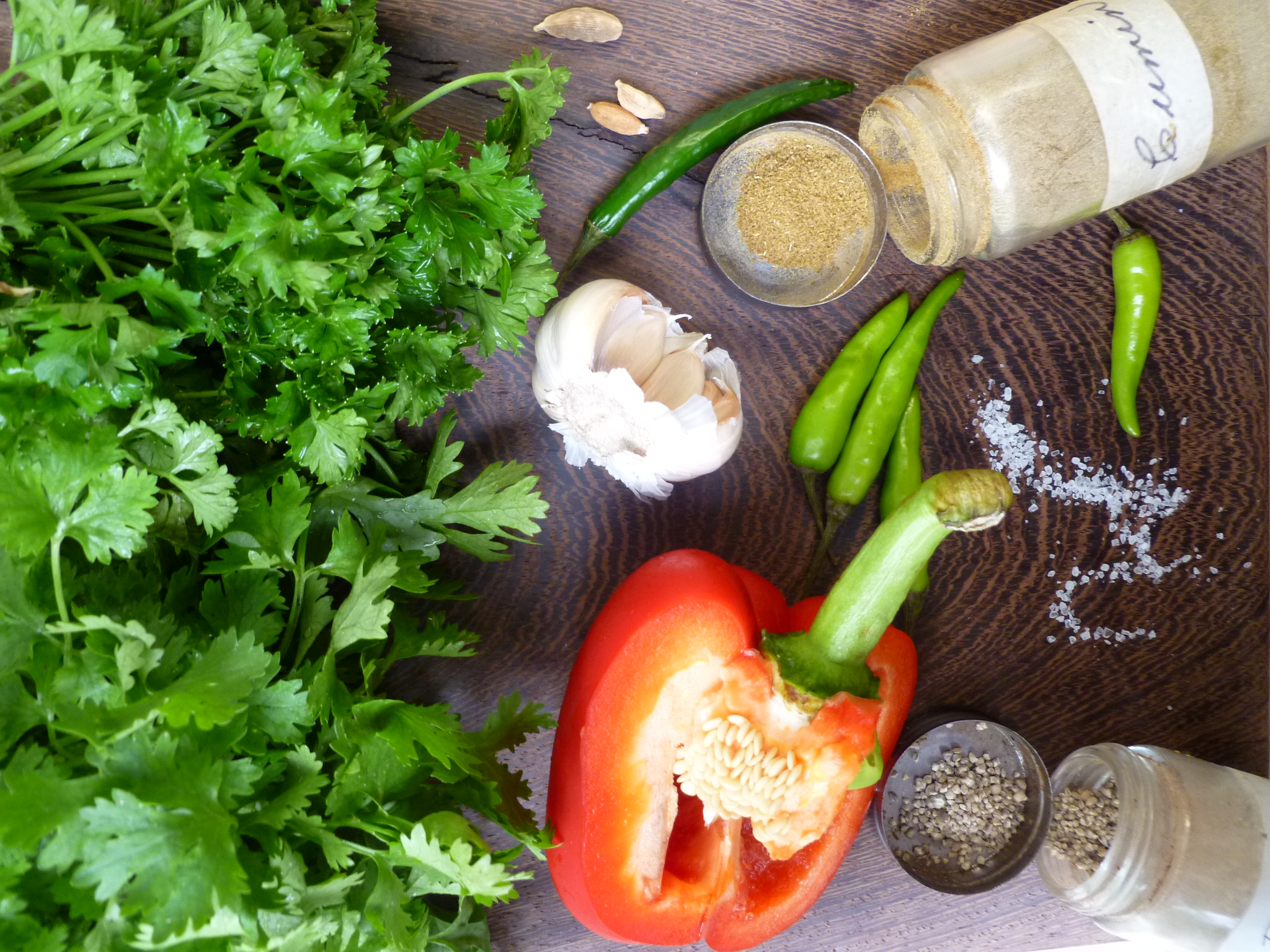 2. Add the cilantro, parsley, cumin, salt, pepper, crushed cardamom and olive oil and process again. The chutney will be textured, not a smooth paste–but if it seems dry, add a few more drops of olive oil and process again.