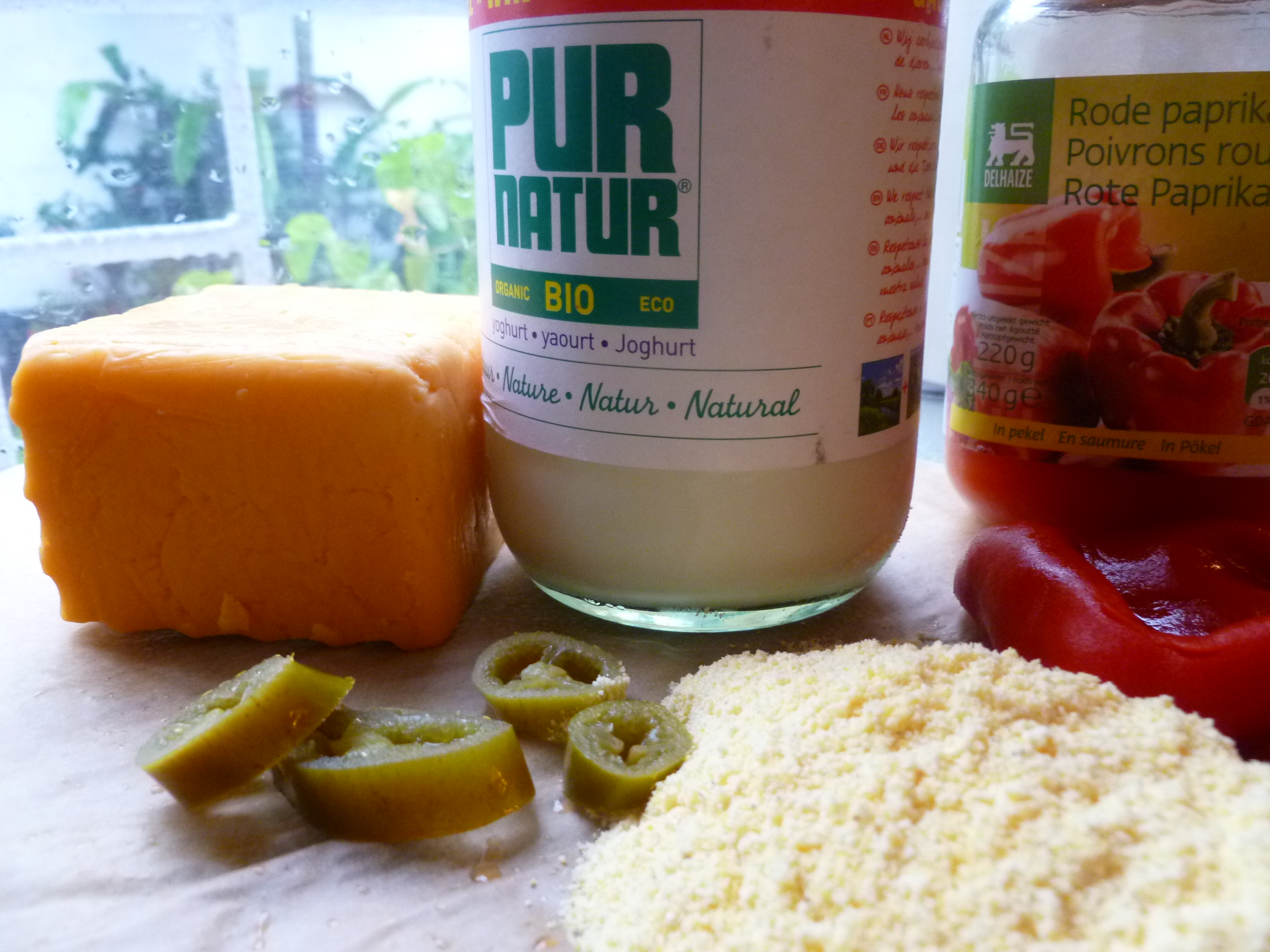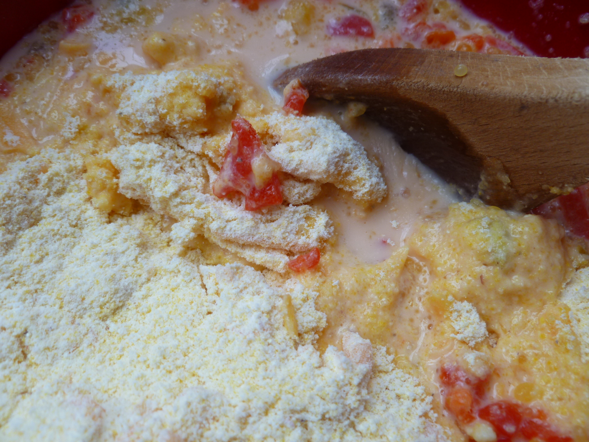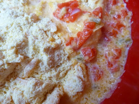 3. In the second bowl, mix the buttermilk (or milk and yogurt), egg, and melted and cooled butter. Sir in the chilies and roasted red pepper.