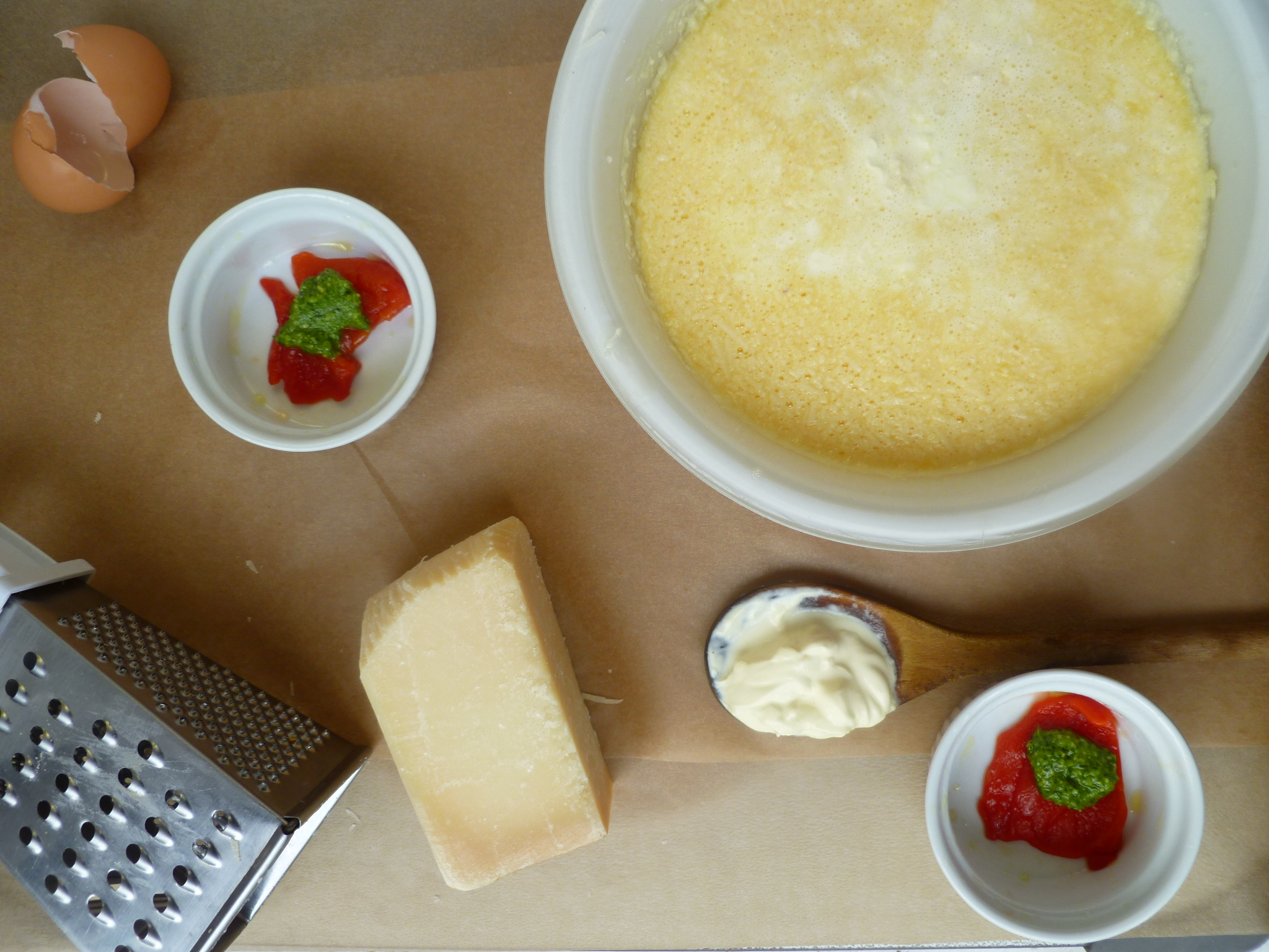 2. Beat the eggs, then mix in the Parmesan and heavy cream. Add a few grinds of fresh black pepper and salt and 1/4 teaspoon of cayenne pepper. Let the batter rest while you make the pesto. (See the instructions below for making the pesto.)