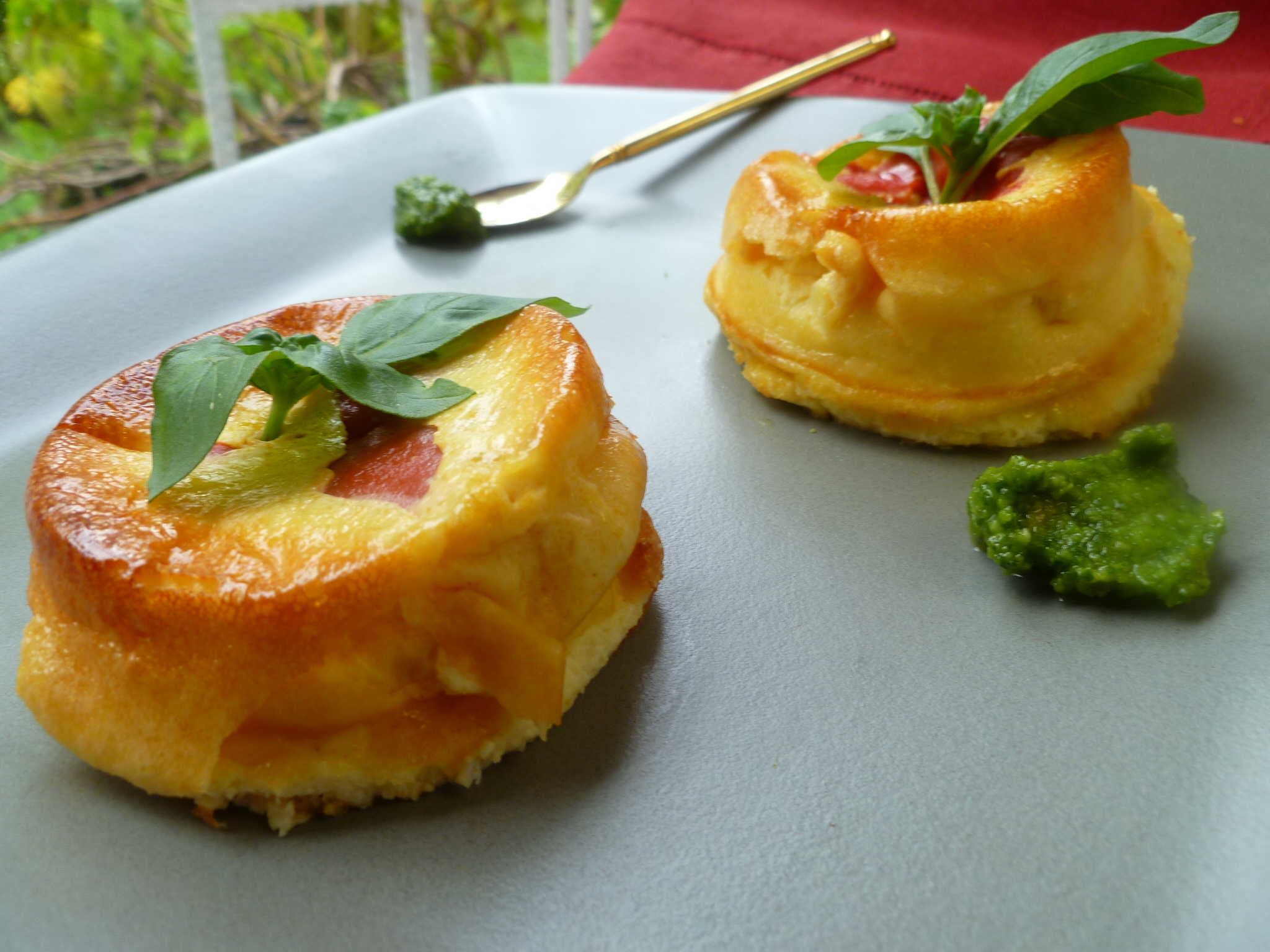 6. Remove the flans from the oven and let them rest for 10 minutes. Then, unmould them onto plates. The flans look pretty decorated with a small branch of basil, a few toasted pine nuts and a tiny spoonful or two of pesto on each plate.