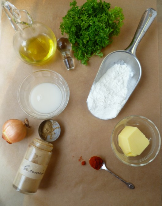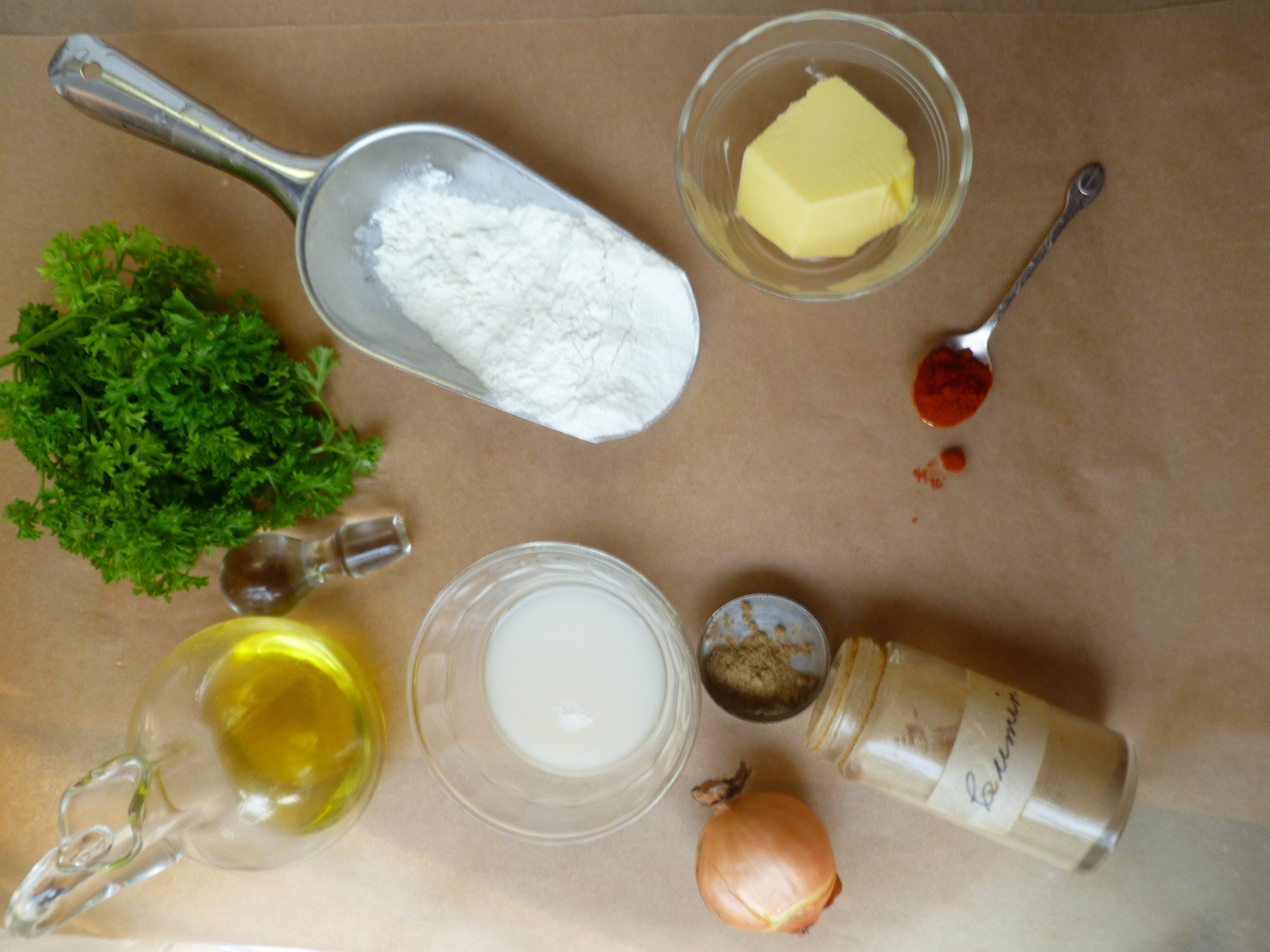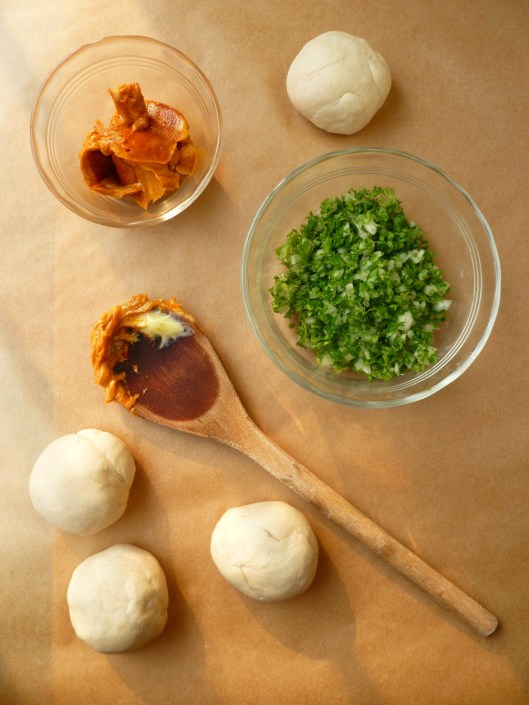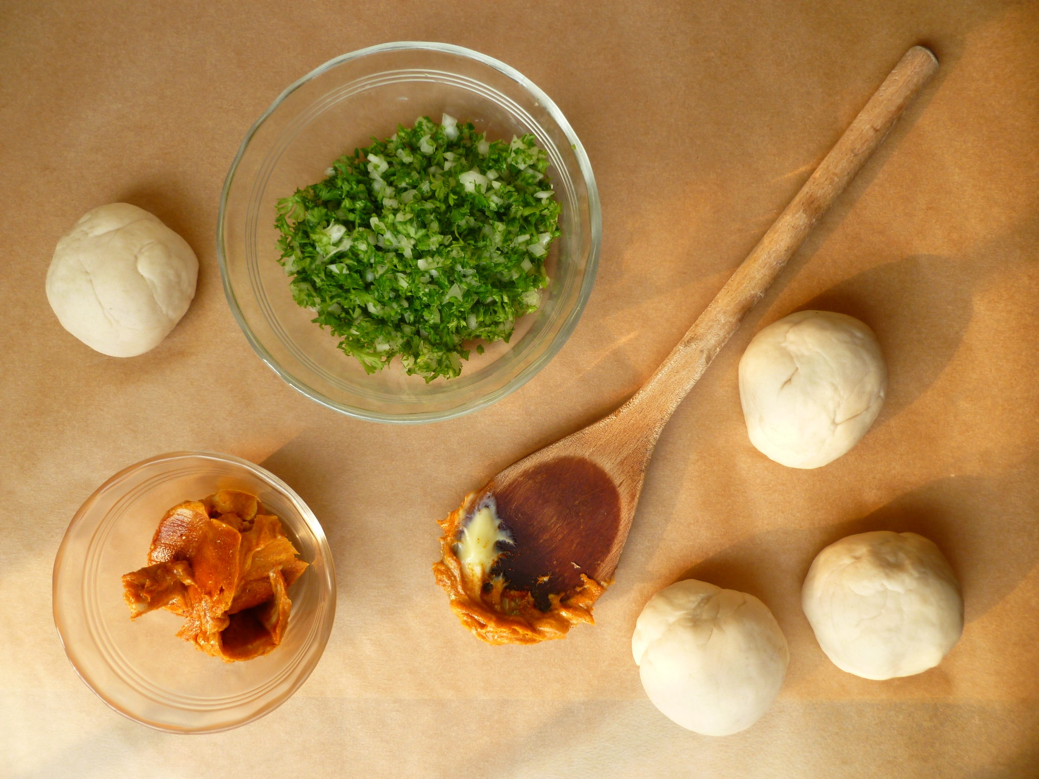 2. Stir the softened butter, paprika and cumin together. Then mix in the chopped parsley and onion and the salt and set the bowl of filling aside: