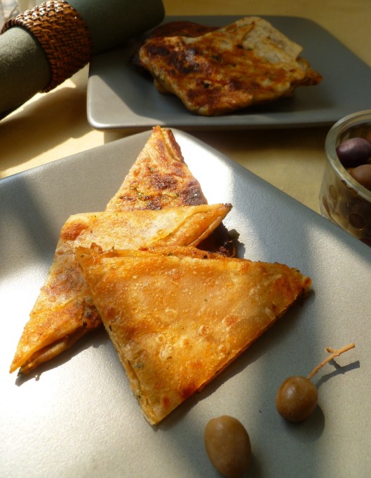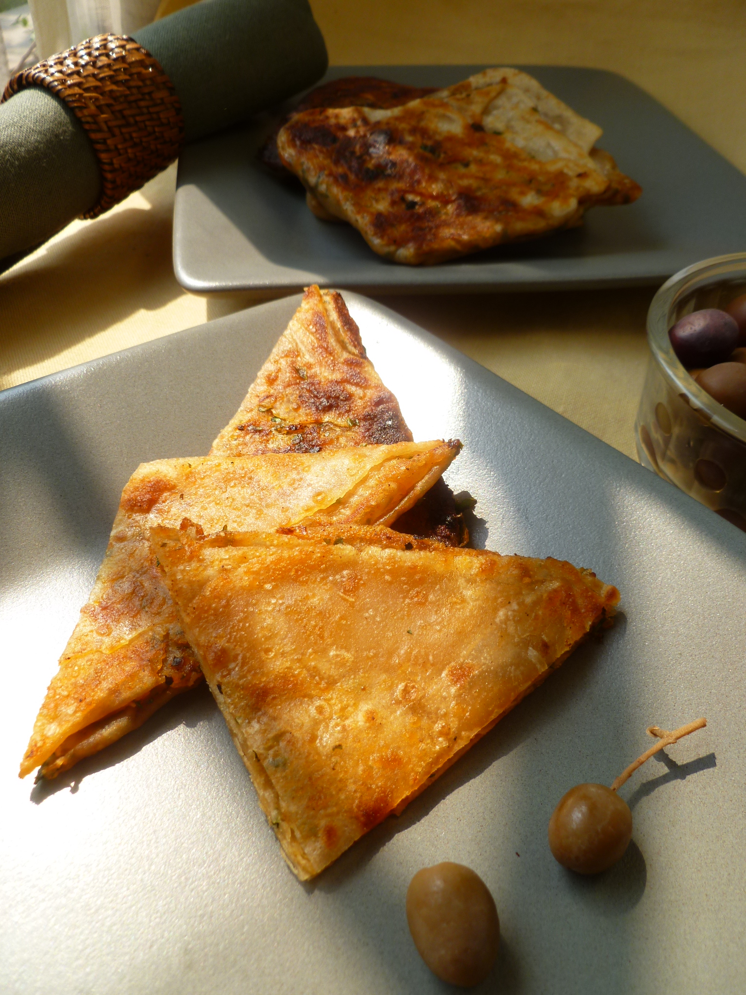 A Suggestion: Besides being a good hors d’oeuvre all on its own, R’ghayef is a nice bread to accompany soup. The small triangles are good, as well, placed around a Greek salad…And, the bread travels well for taking on picnics.