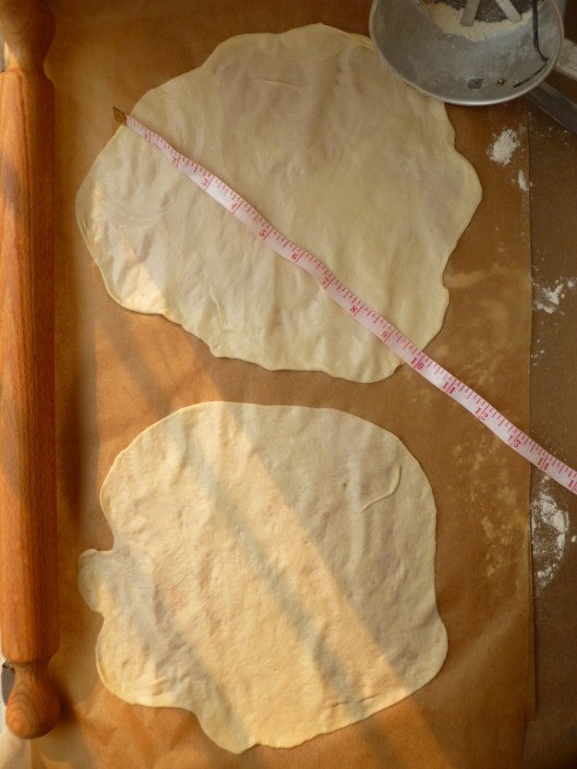 4. Place a ball of dough on the board and roll it out into a circle of about 10-inches (26cm) in diameter. Flip the circle once, as you roll it out, so that both sides of it are pressed against the oiled surface. The circle won’t be regular. Transfer the circles, as you make them, to the sheets of parchment paper (2 circles per sheet):
