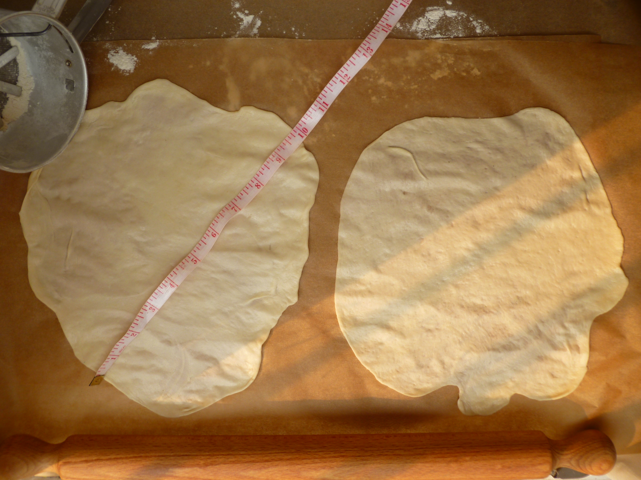 Compare: The surface of the dough for the flatbread on the left had some small tears in it; the other didn’t. Both are eminently edible:
