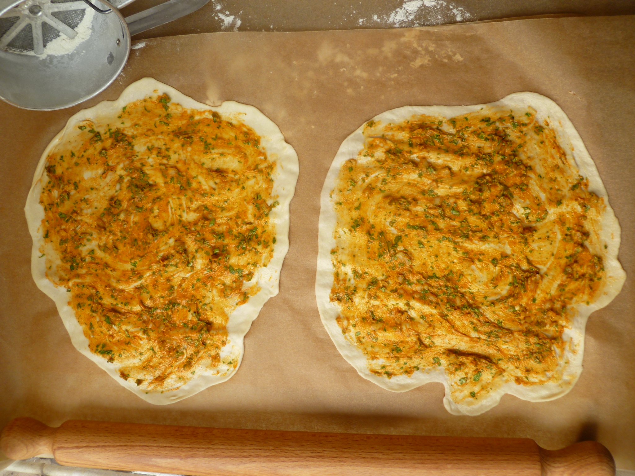 5. When all 4 dough balls are flattened into thin circles, divide the filling among them and spread it out over their surfaces with your fingers. (Forming these flatbreads may lead you on the backroads of your memories to preschool days of fingerpainting and modeling clay.):