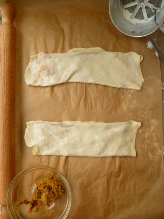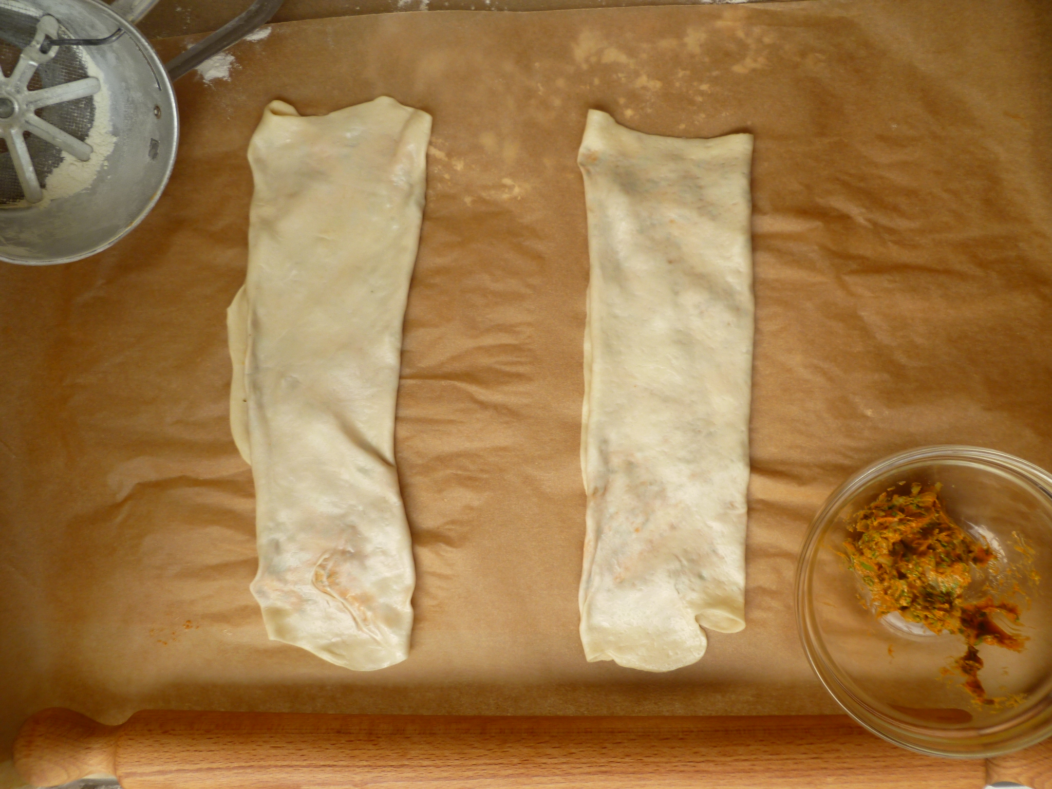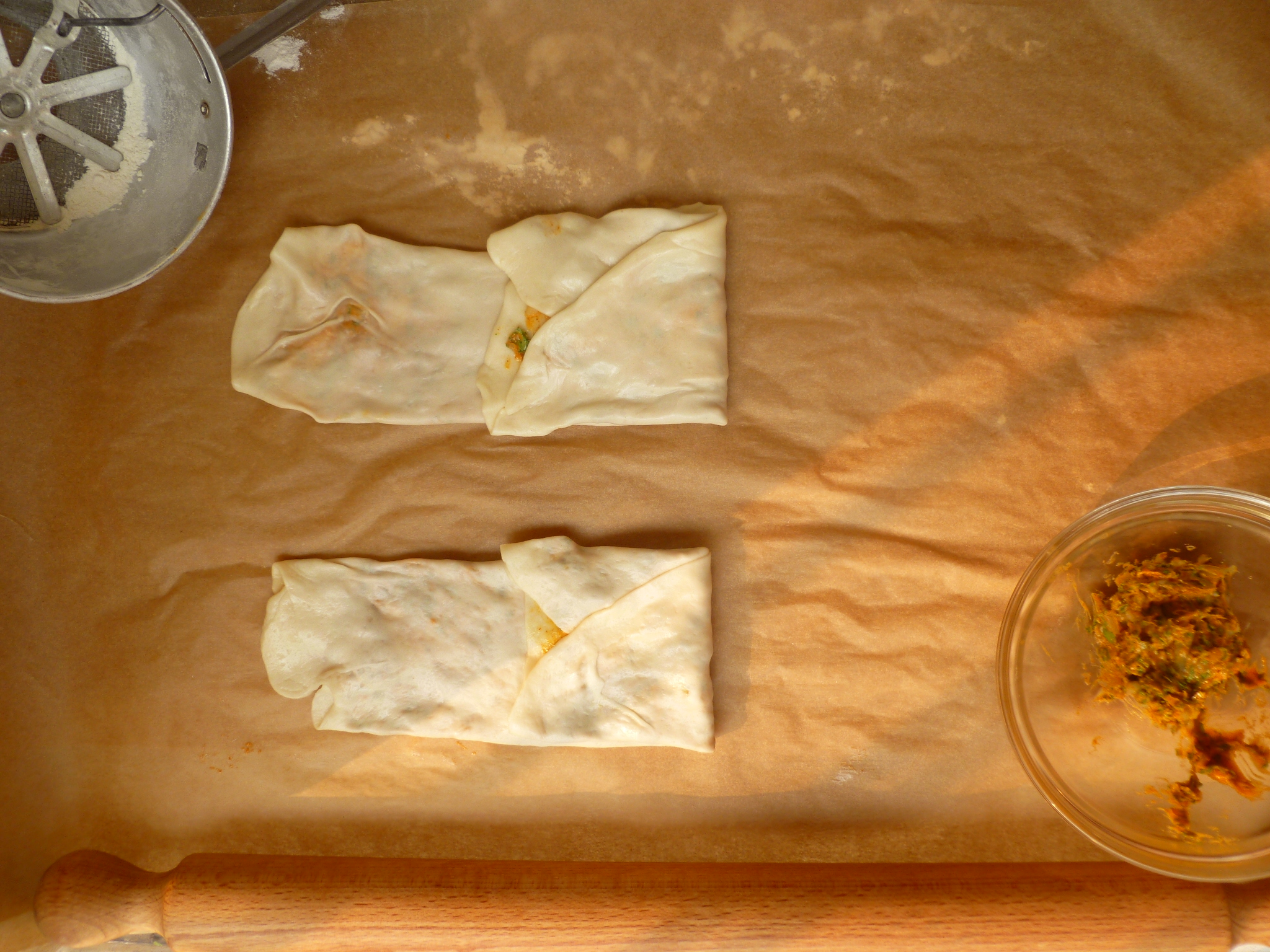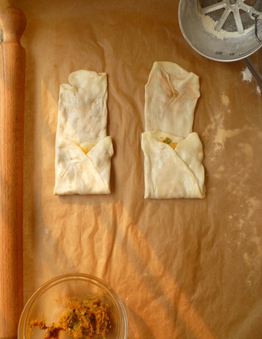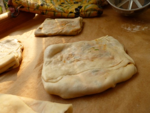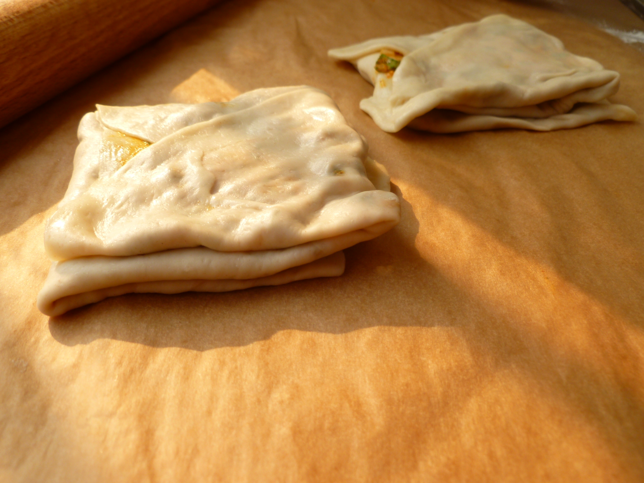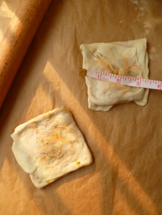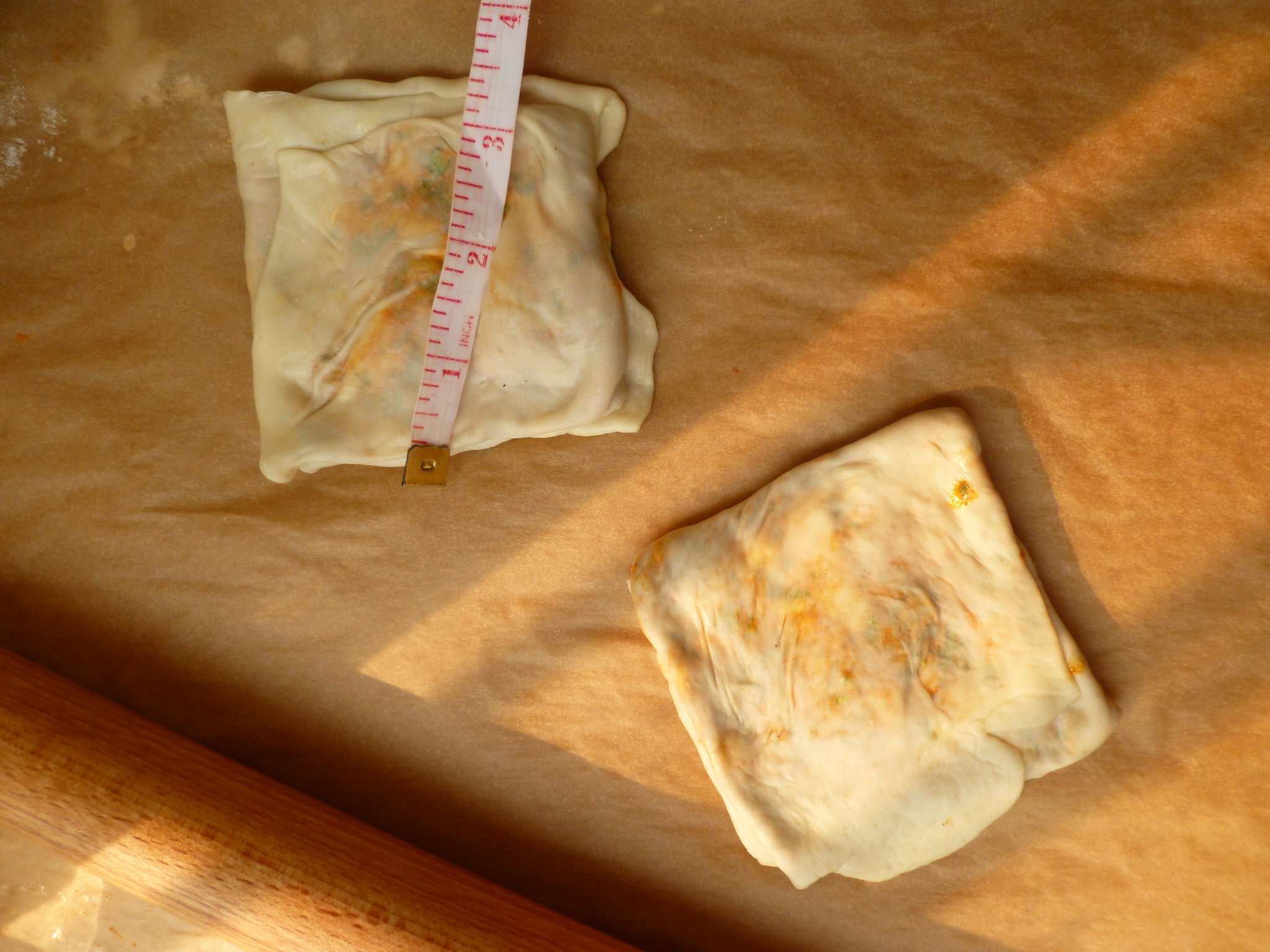 9. Pull the top fold of dough across to cover the filling that shows in the V-shaped space on the top of each square. Then make the squares slightly larger by placing each one in the palm of one hand and pressing and pushing out on it gently with the rounded part of the palm of your other hand. Ideally you do this without making any tears in the pastry. But…sometimes tears happen. Small ones may be pressed back together. If a little filling presses through the cracks, the finished bread will be colored by the paprika and more buttery on the surface than squares without tears. Either way, the bread will be good. The enlarged squares will be between 3 and 4-inches in size: