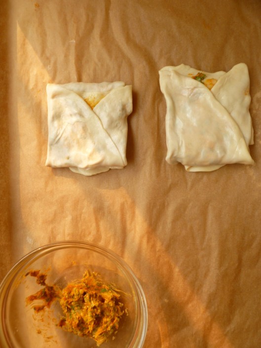 8. The squares are between 2 and 3-inches in size and made up of 3 layers of filled dough: