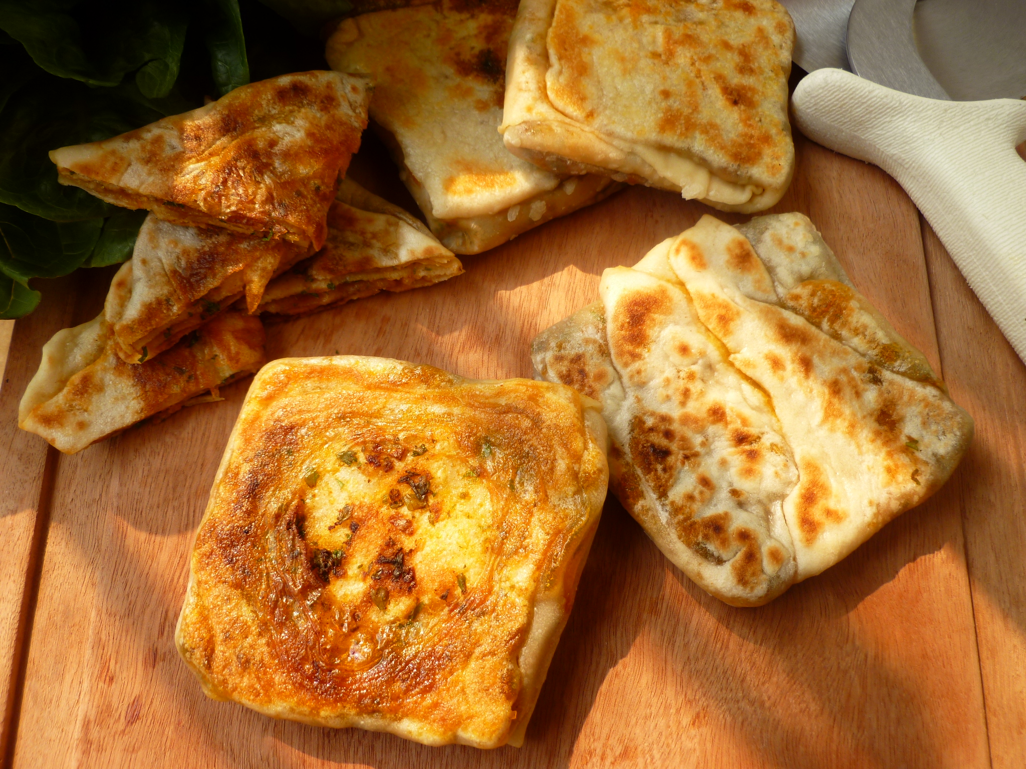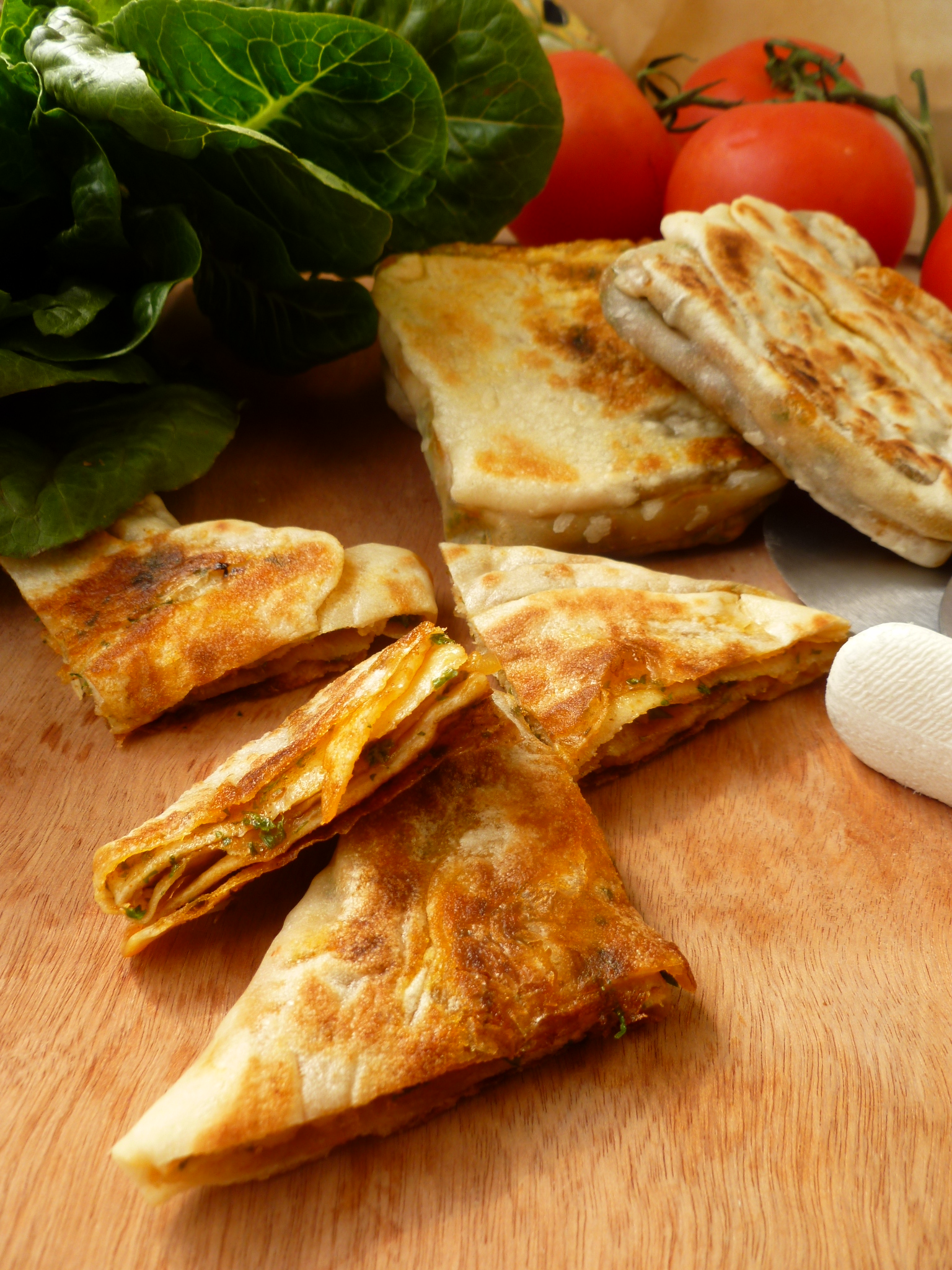 2. As they are done, transfer them to a cutting board, cut each flatbread into 4 triangles and serve them hot: