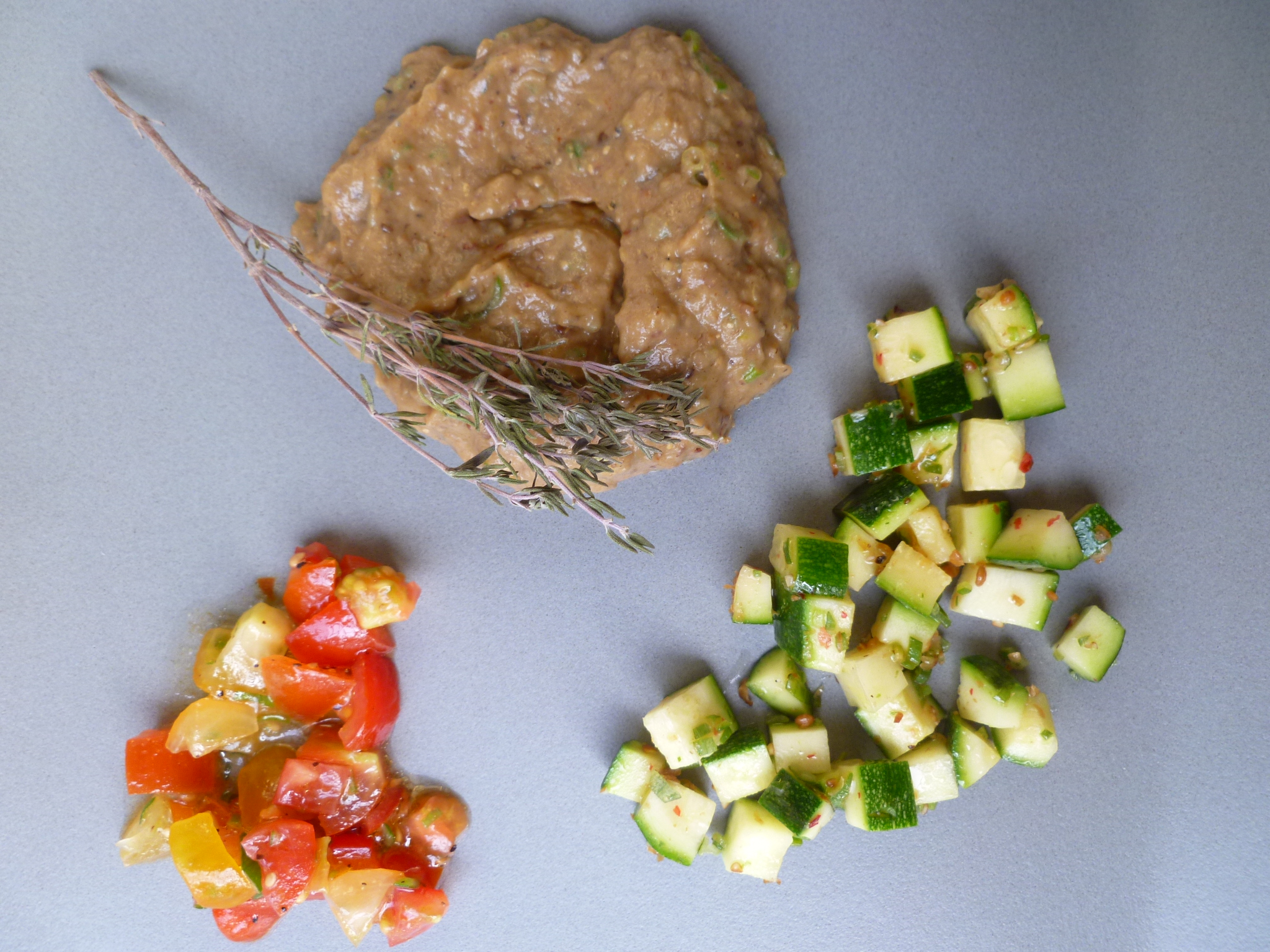 1. Spoon into each glass: first, a layer of eggplant; second, a layer of zucchini; and last (on top), a layer of marinated tomato.