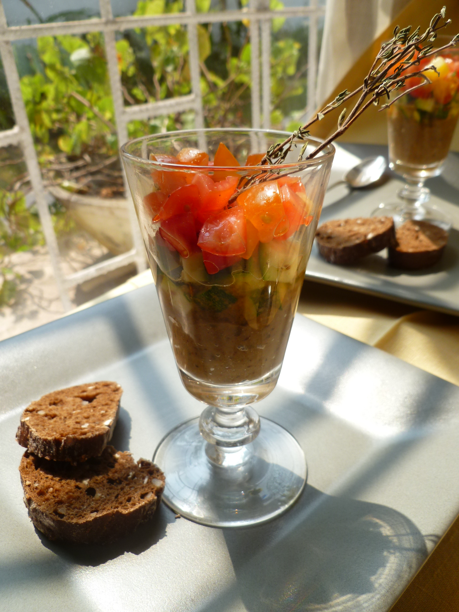 2. Place two rounds of bread at the side of each verrine. Arrange a twig of dried thyme on top.