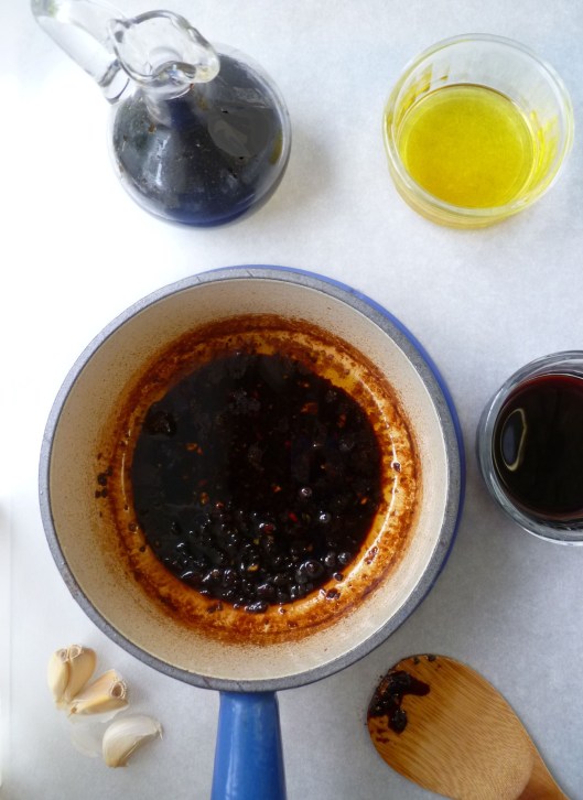 5. Just before serving, drain the beans and dry them in a cotton towel. Bring the balsamic reduction to a simmer over medium heat, add the beans and toss them around, just long enough to coat them in the sauce and heat them through: