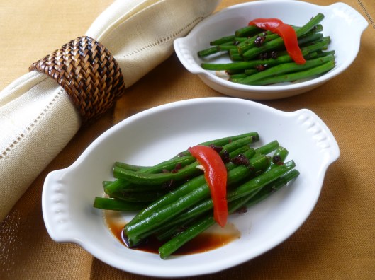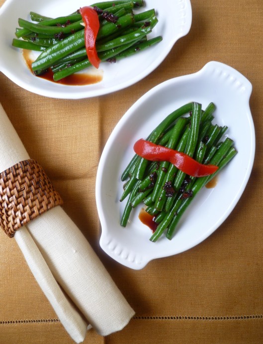 6. Arrange the beans in bundles on side plates or next to the Main Course. Strips of roasted red pepper look nice placed over them: