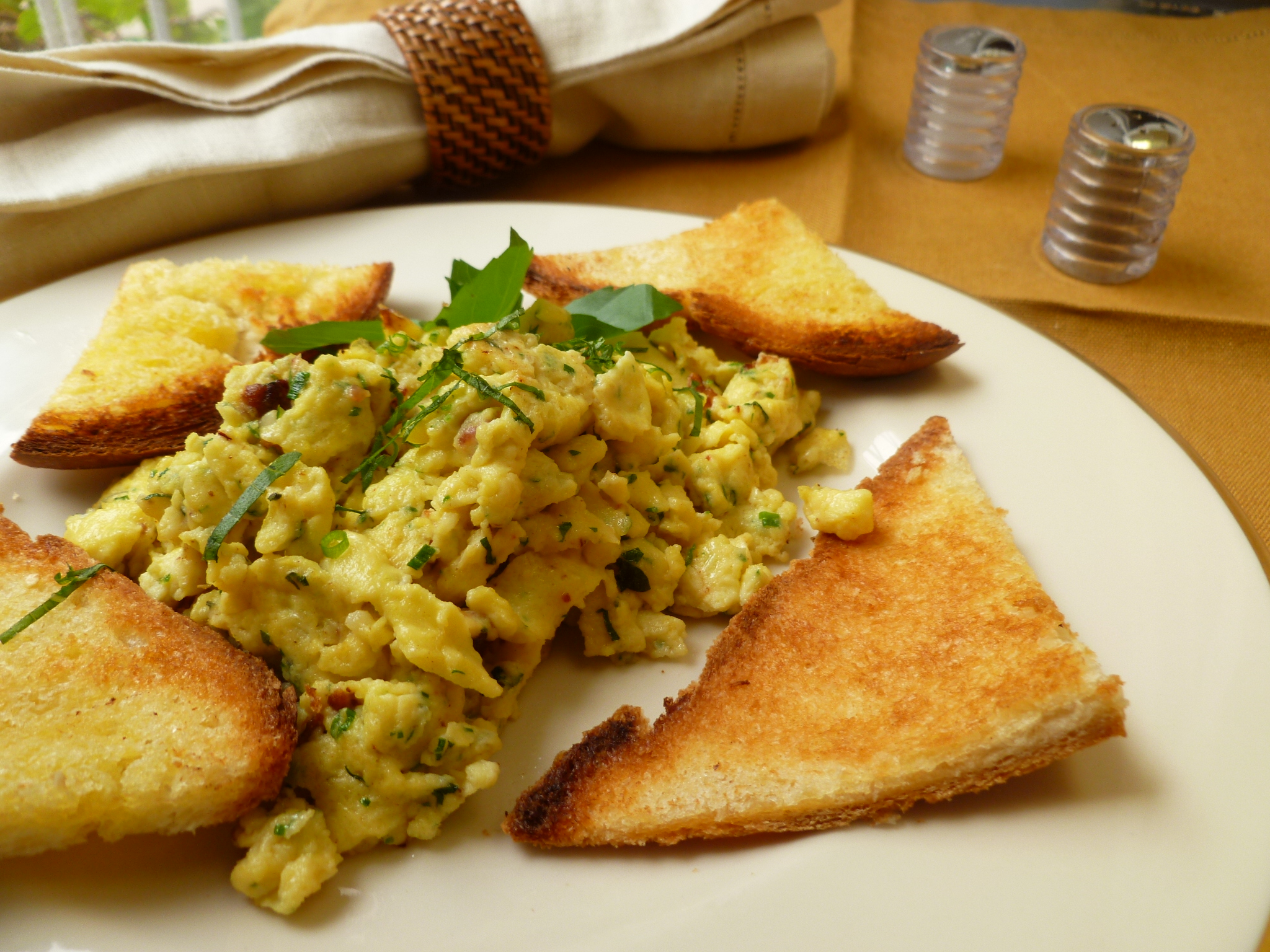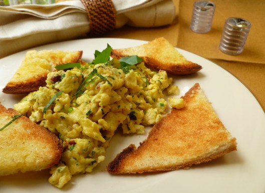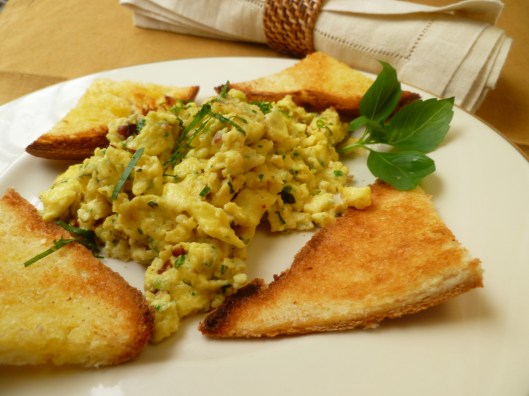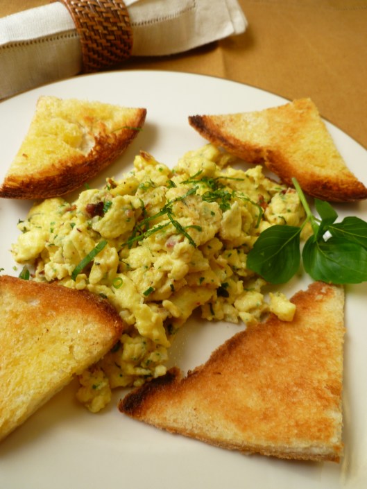 9. The eggs–left in the pans on the back of the stove and loosely covered–should still be warm. Divide the Eggs Carbonara among the plates, and sprinkle each plate of eggs with the slivered basil and chopped green onion. Arrange 4 toast triangles on each plate, with a small branch of fresh basil at the side.