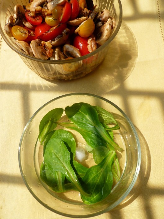 2. Pour this vinaigrette over the sliced mushrooms and tomato halves and set the salad aside at room temperature for 30 minutes.