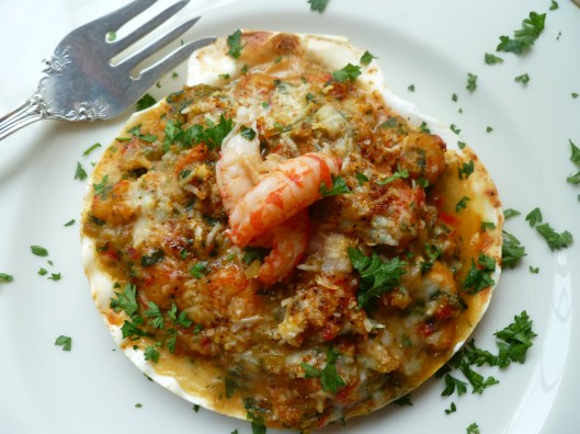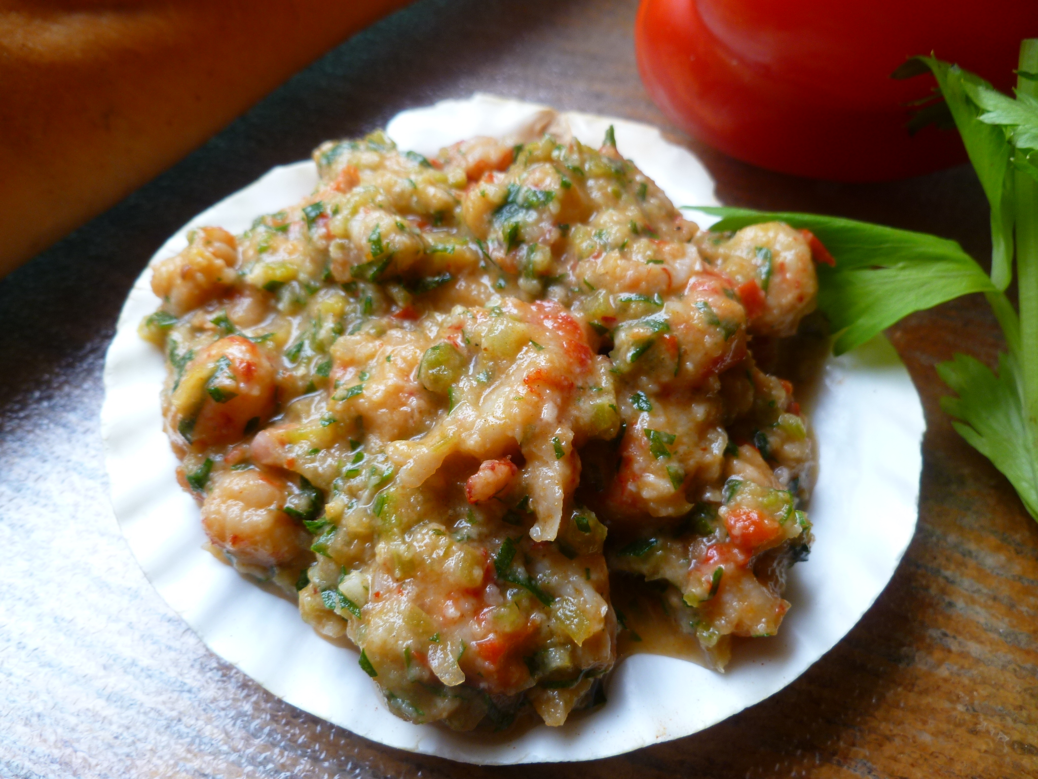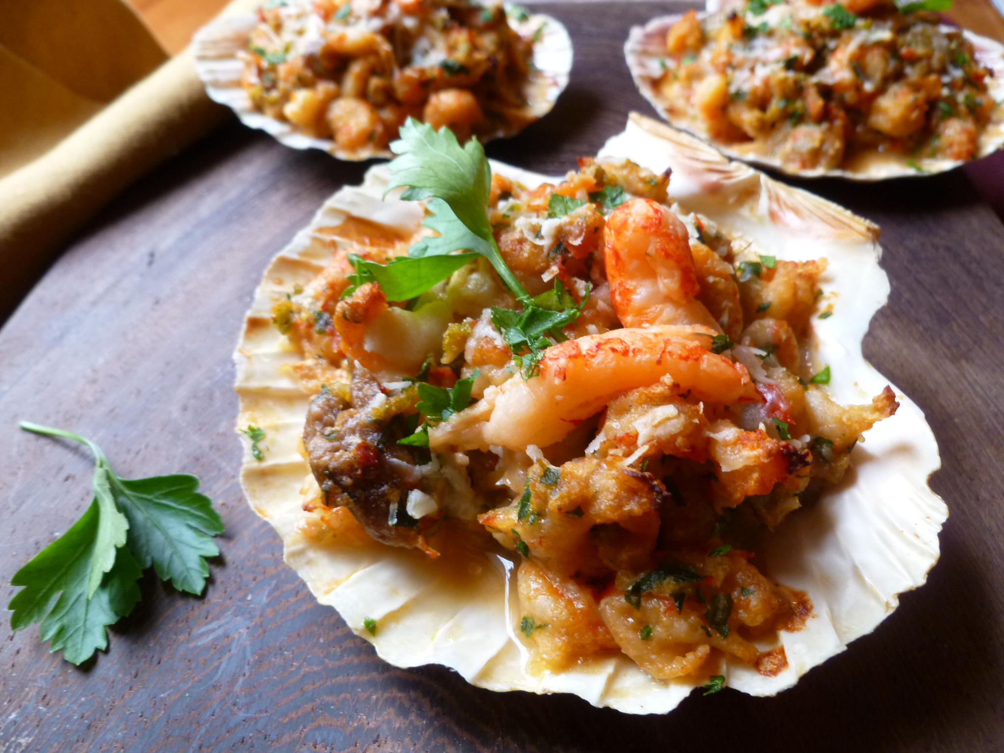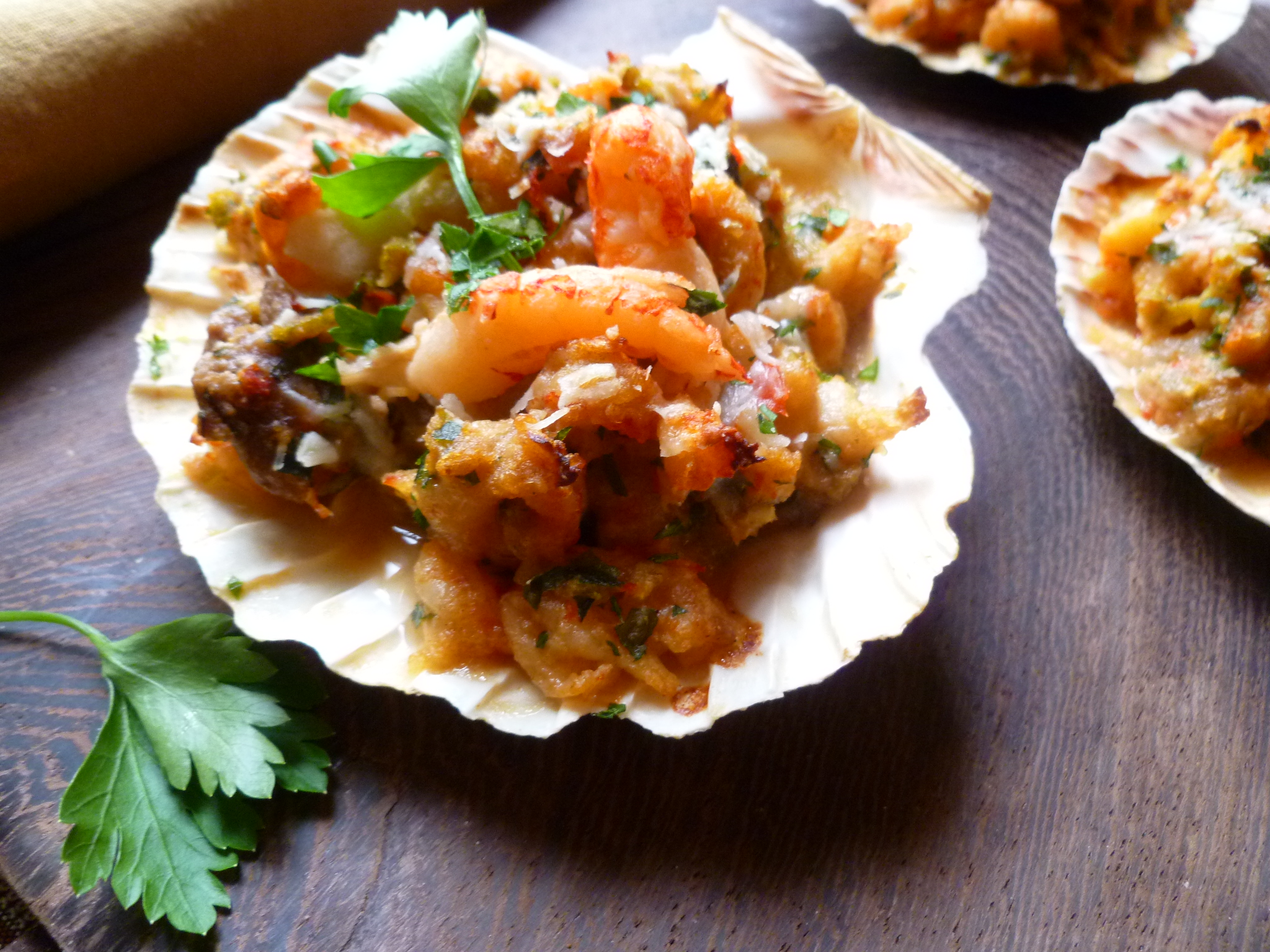7. Sprinkle each shell or ramekin with some chopped parsley, garnish each shell with 2 additional crayfish tails and serve.