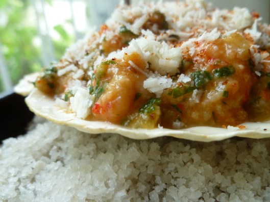 - If using scallop shells: 1 or 2 rimmed Baking Pans sprinkled with a layer of Coarse Sea Salt: The salt isn’t essential but is very useful for keeping the shells in a stable, upright position. Here in a previous dk post is a photo (and description) of the cheap variety of salt used for this purpose.