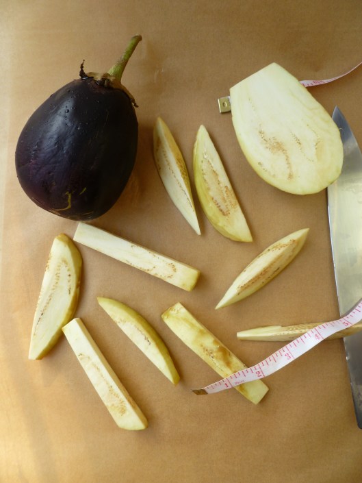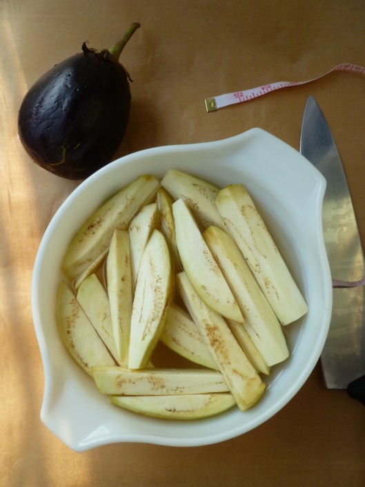 1. Fill the mixing bowl with salted water. Peel the eggplants and cut them into large French fries–about 1/2-inch (1 cm) thick. Another way of describing the cut and size is: Cut the eggplant as you would potatoes for making ‘Steak Fries’: