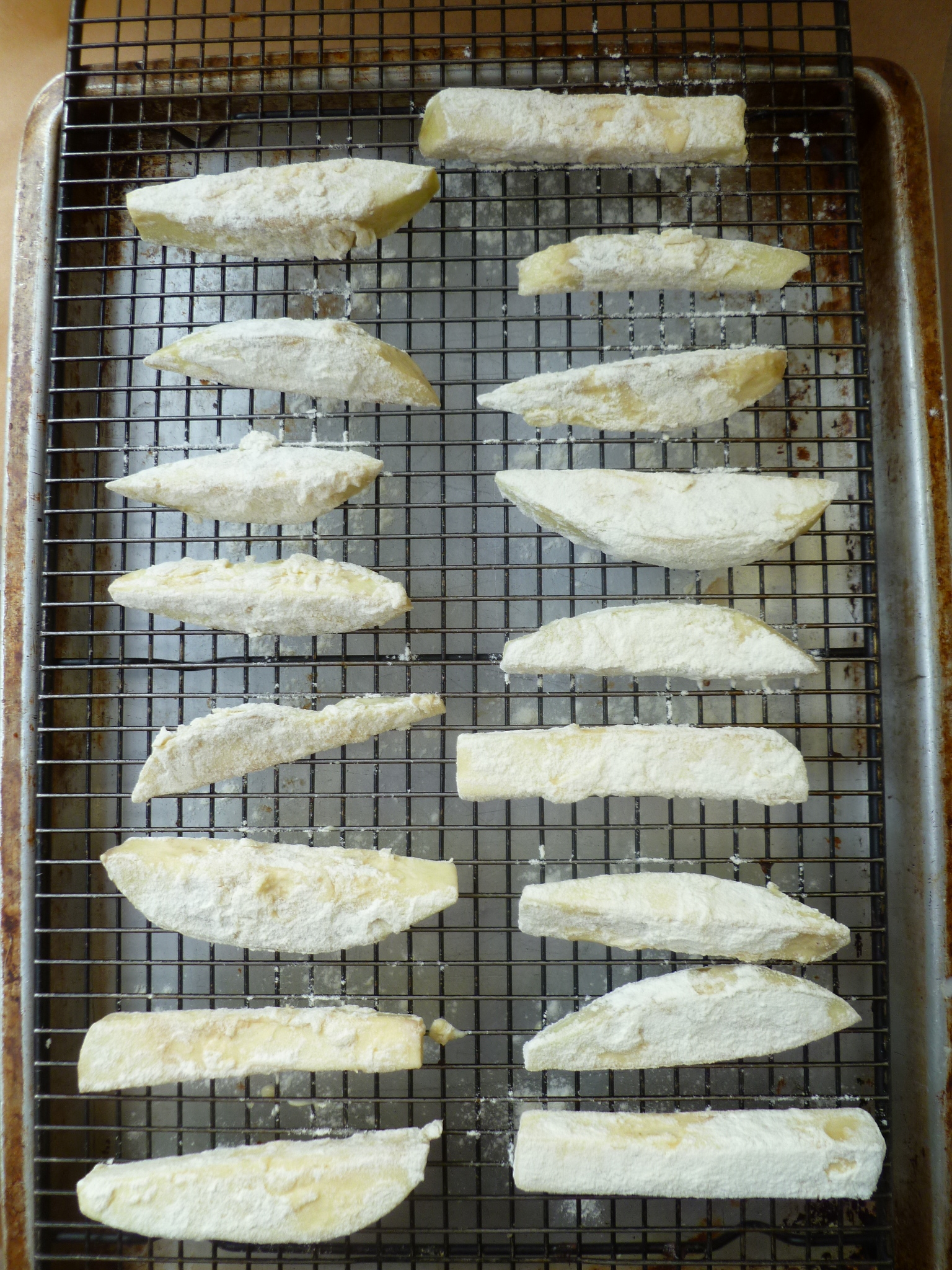 …and place the battered fries on one of the cooling racks set in a rimmed baking pan: