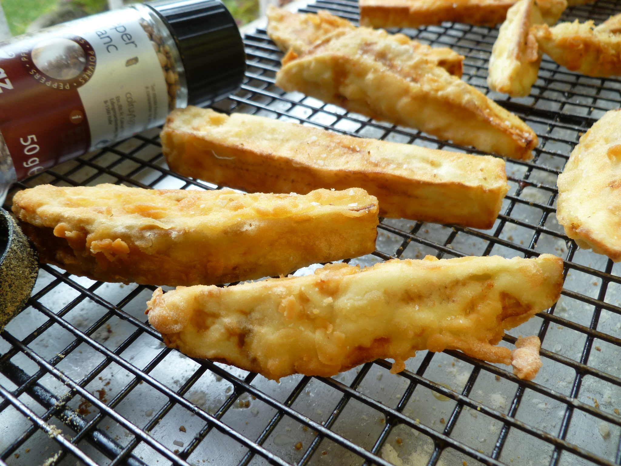 5. Heat the oil in the frying pot or deep skillet to around 375 F. Fry the eggplant slices a few at a time, adjusting the heat to keep the oil at a temperature between 350 and 375 F. A batch of 4 will be done in 3 – 4 minutes. Place the fries to drain on the second cooling rack placed in a rimmed pan. Sprinkle them with a few grinds of salt and white pepper and serve them hot.