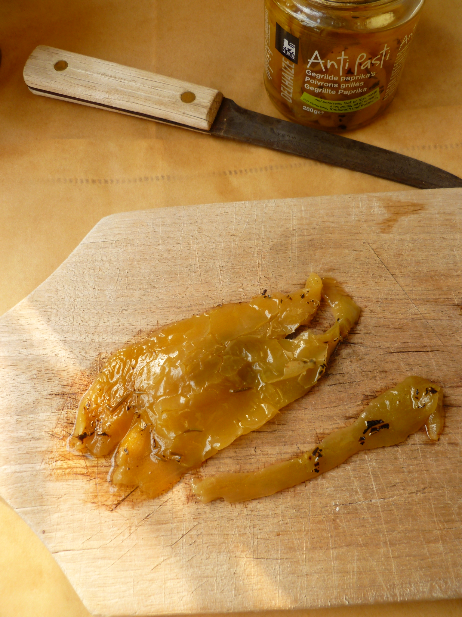 - Bottled Grilled, Marinated Peppers, cut into strips or Bottled (unmarinated) Grilled Red Peppers, cut into strips