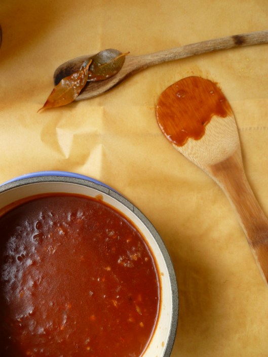 2. Remove the bay leaves. Add the Tabasco and taste the sauce. Wait a minute to allow the flavour of the Tabasco to make itself apparent–then add a bit more if you like.