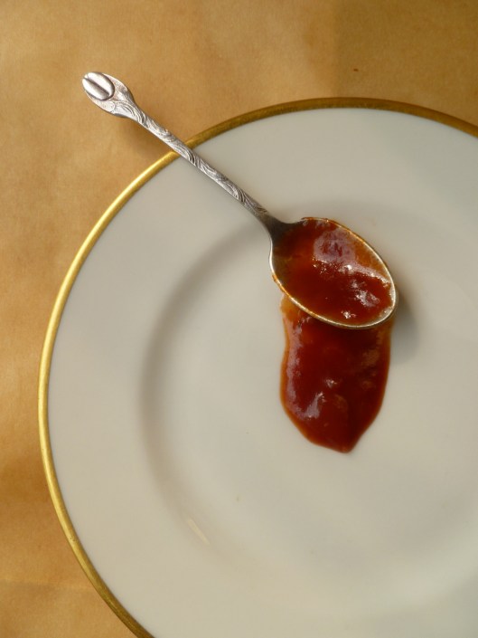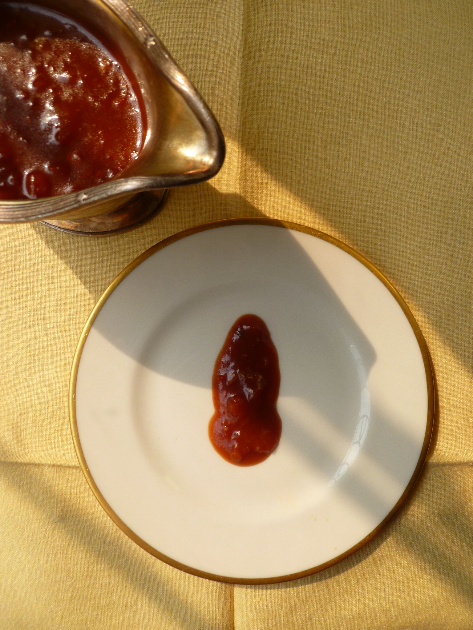 …Another sign that the sauce has reached the right consistency is that a little of it, spooned on a plate, will spread a bit and then stop: