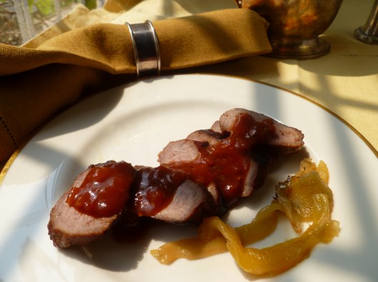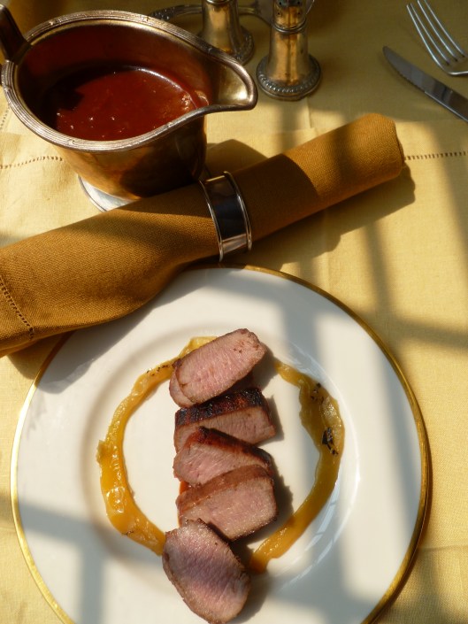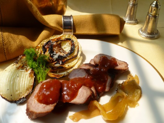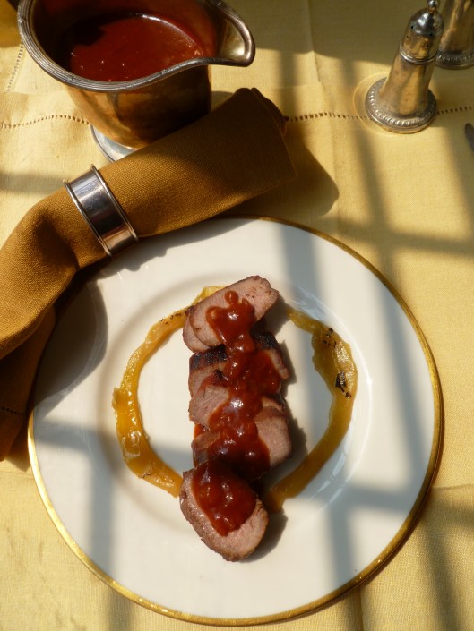 …Pour a little more sauce down over the slices of lamb. (Whatever is served with the lamb may be arranged on either side of it):