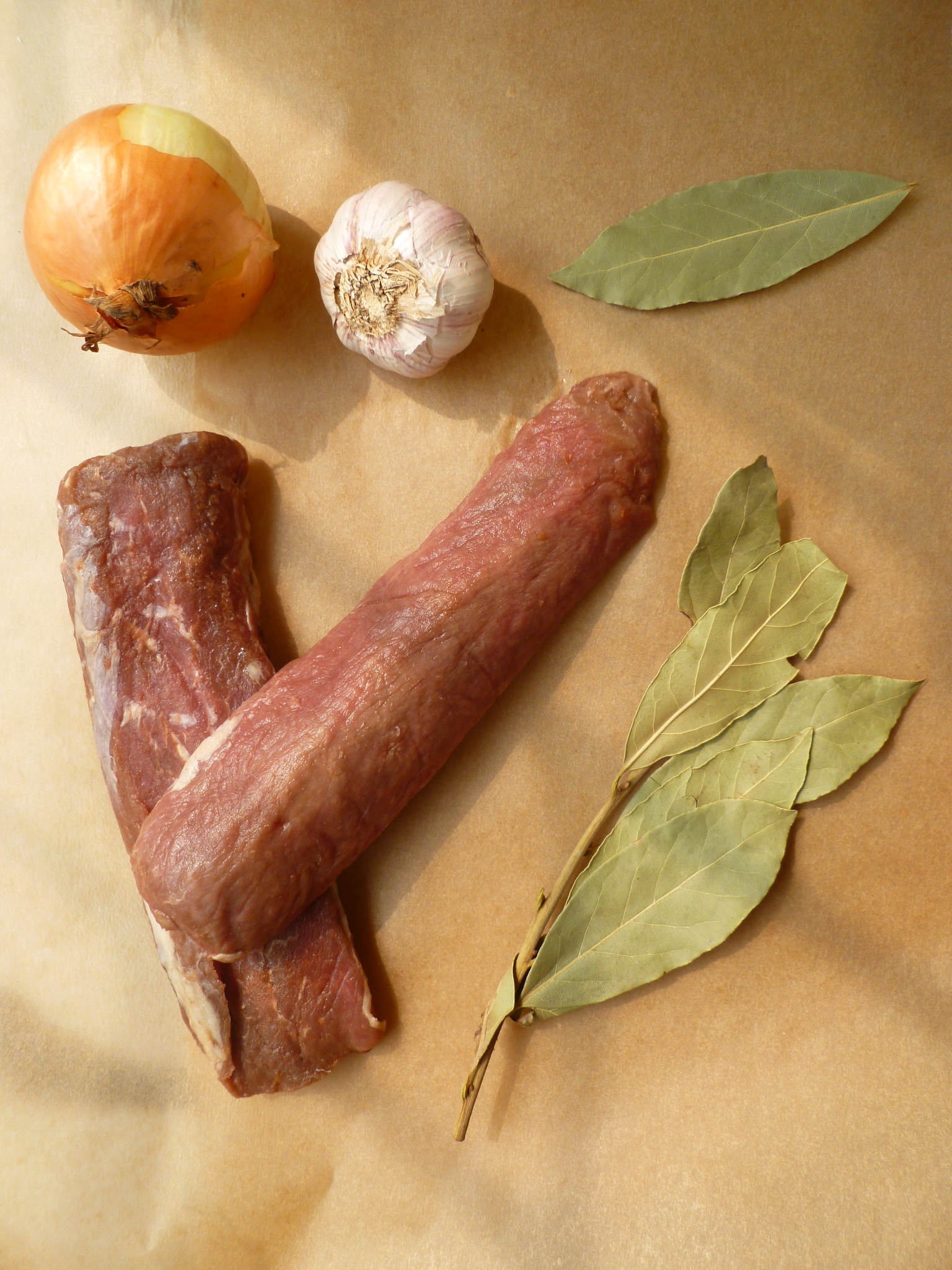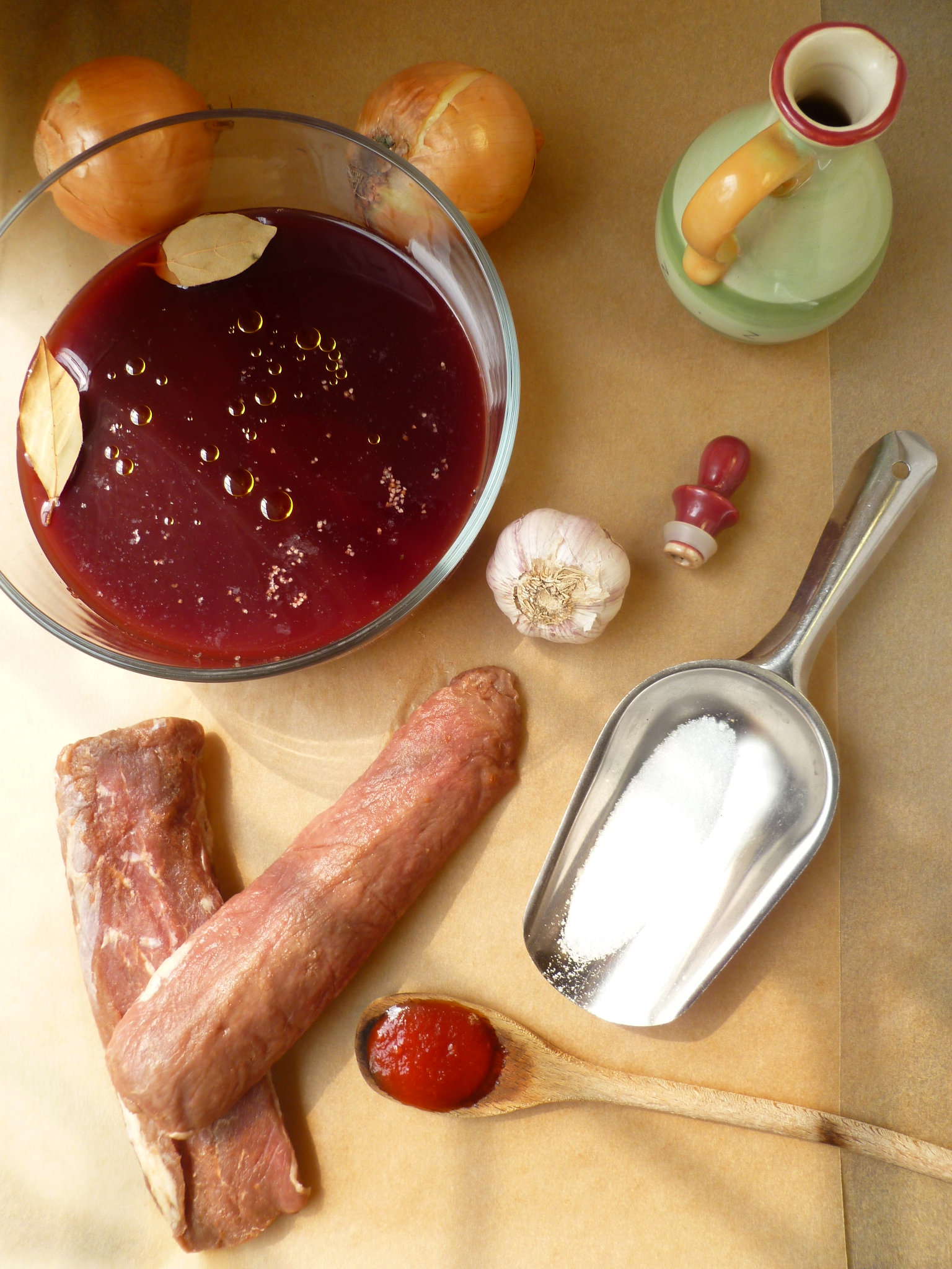 1. Mix together the marinade ingredients: the chili sauce, red wine vinegar, olive oil, beef bouillion, sugar, salt, black pepper, bay leaves, onion, garlic and rosemary. Pour the marinade into an earthenware or glass casserole or a ziplock plastic bag large enough to hold the loins of lamb, add the lamb and marinate it for up to two days in the refrigerator.