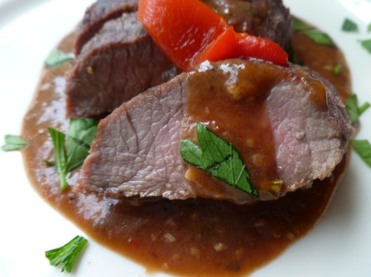 ….Arrange the slices of lamb on top of the sauce and some strips of pepper around the inner rim of each plate: