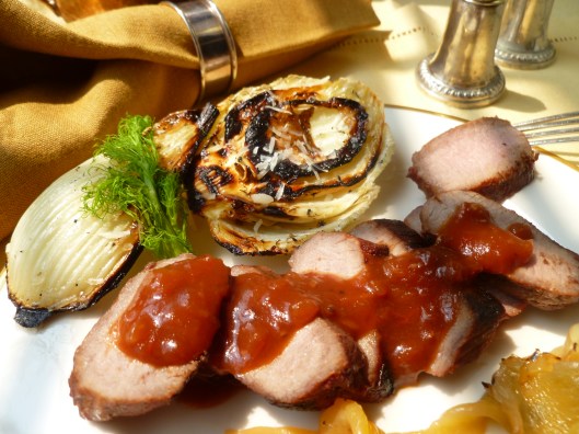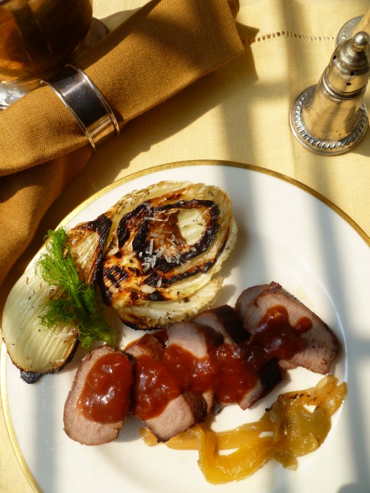 A Note: Grilled Caramelized Fennel accompanies Grilled Boneless Loin of Lamb with Sauce Creole in the Dinner Menu: Dinner ‘Louisianne’. The recipe is based on one from Yotam Ottolenghi’s cookbook Plenty (2010).