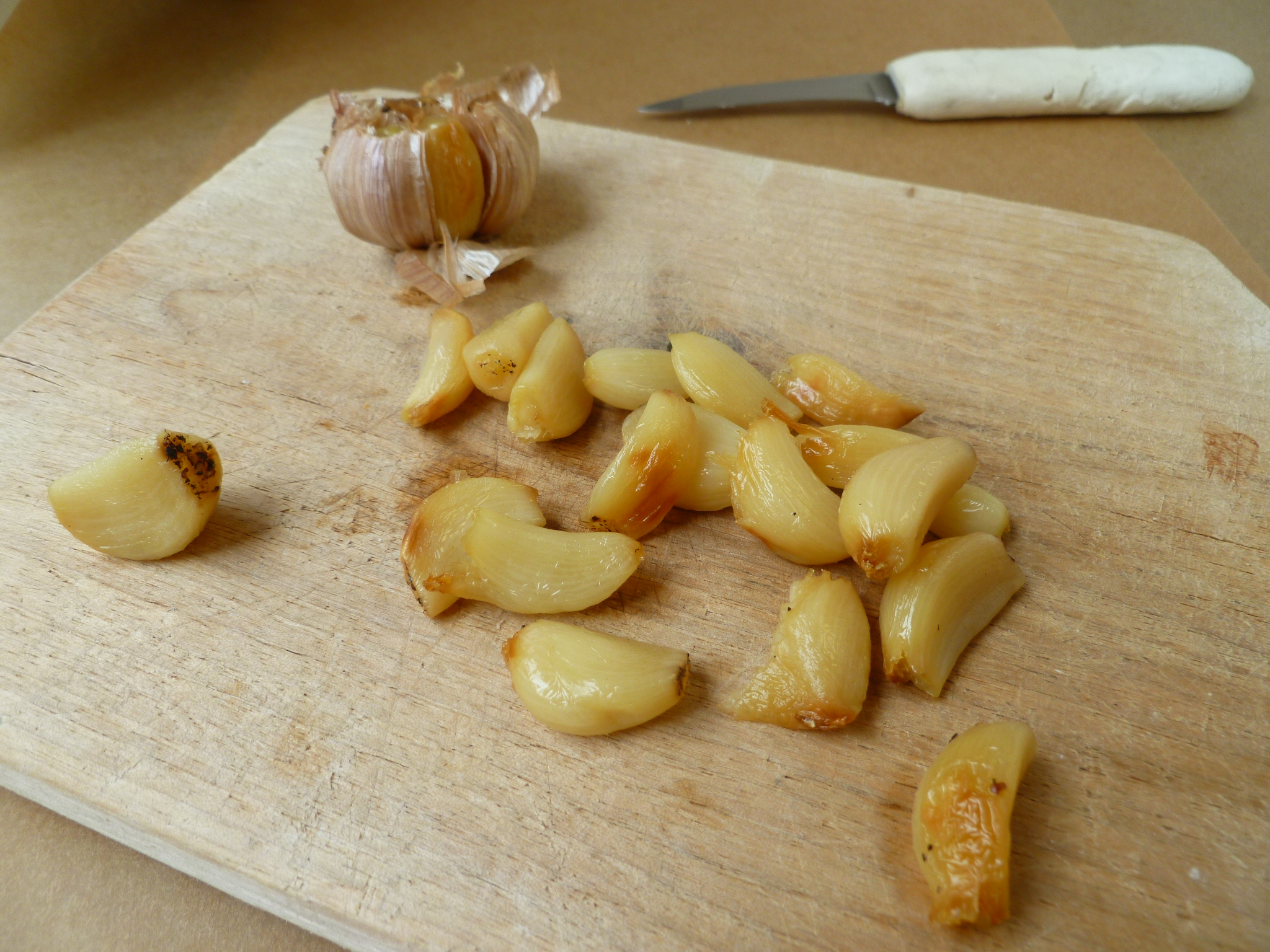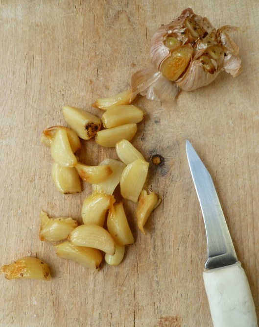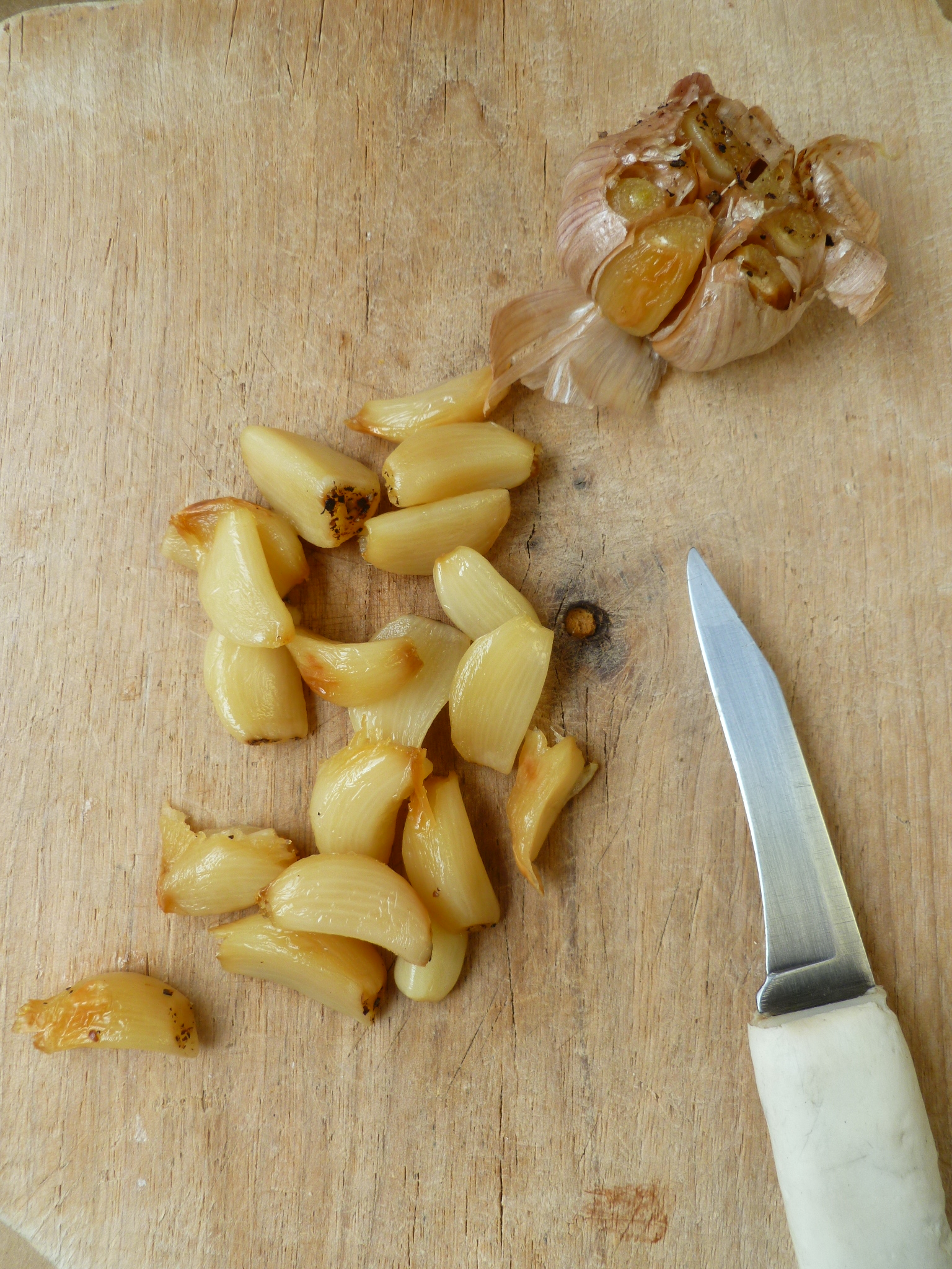 4. Roast the garlic for about 30 – 45 minutes or until the bulbs are tender. Cool them and gently squeeze the soft cloves out of their peels. Reserve 8 whole cloves to garnish the potatoes on the plates and roughly mash the rest of them–with the back of a wooden spoon, for example.