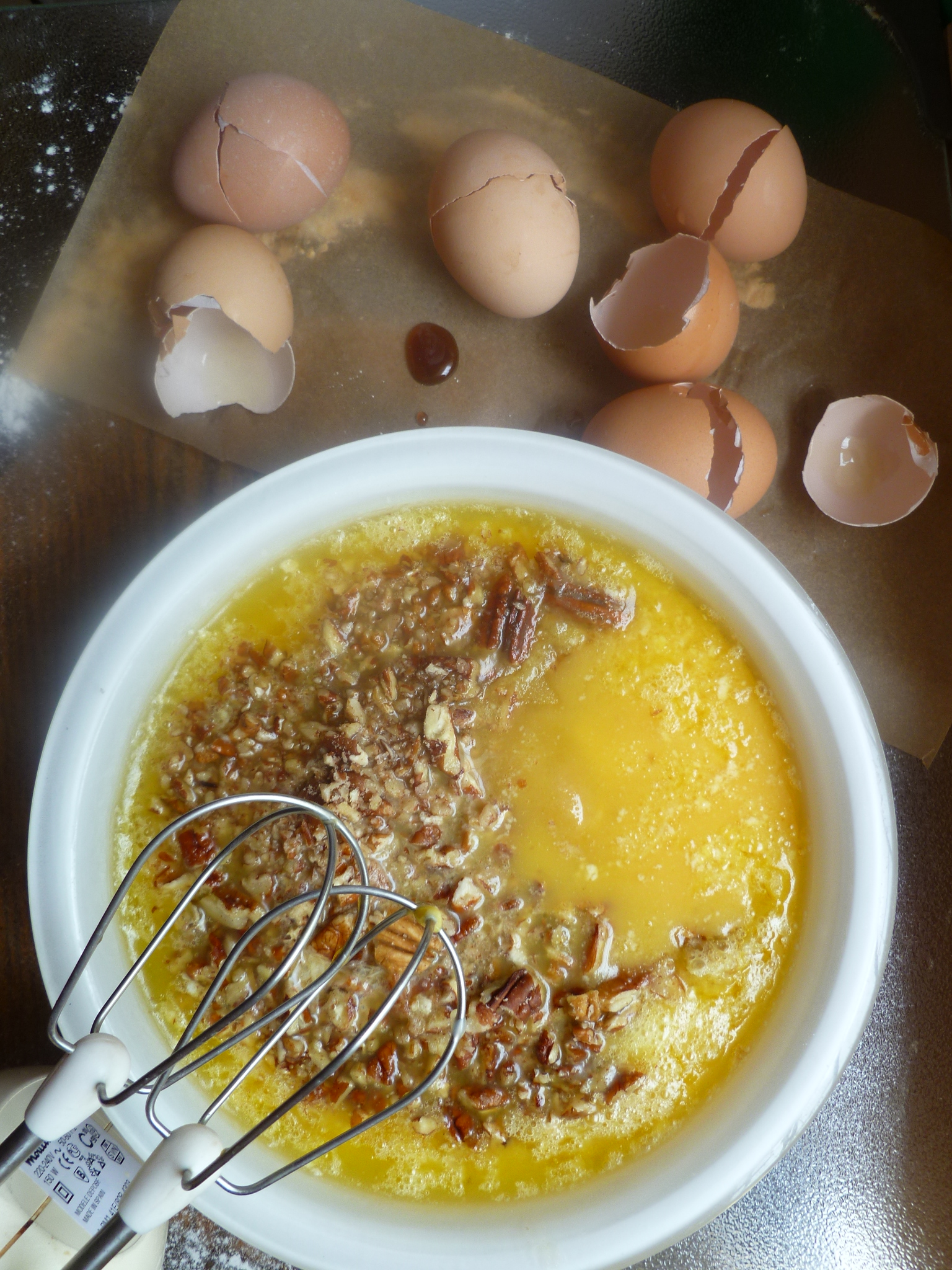 4. Mix in the corn syrup and butter. Then stir in the chopped pecans: