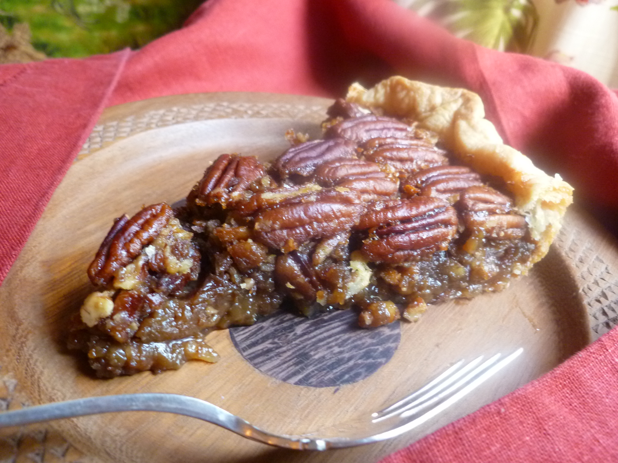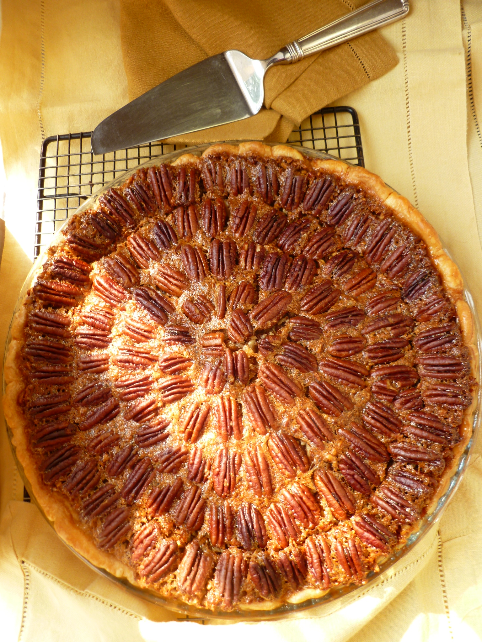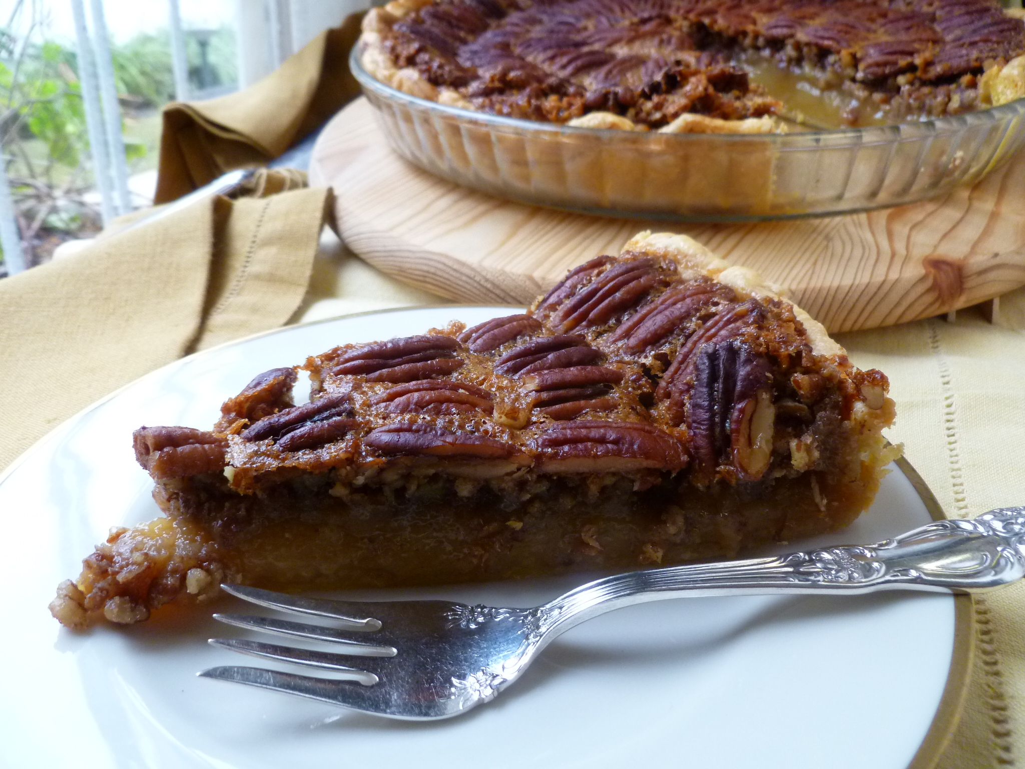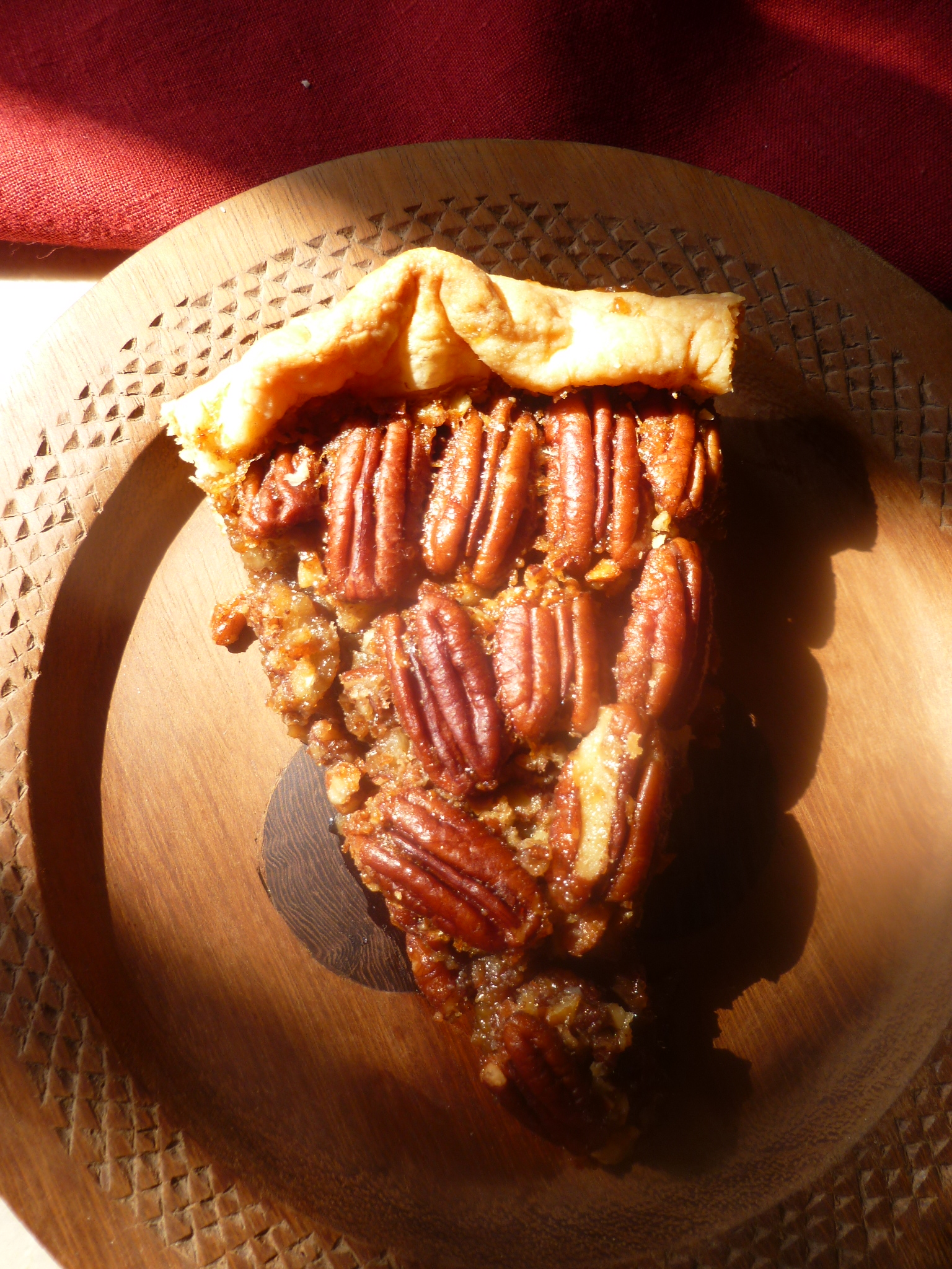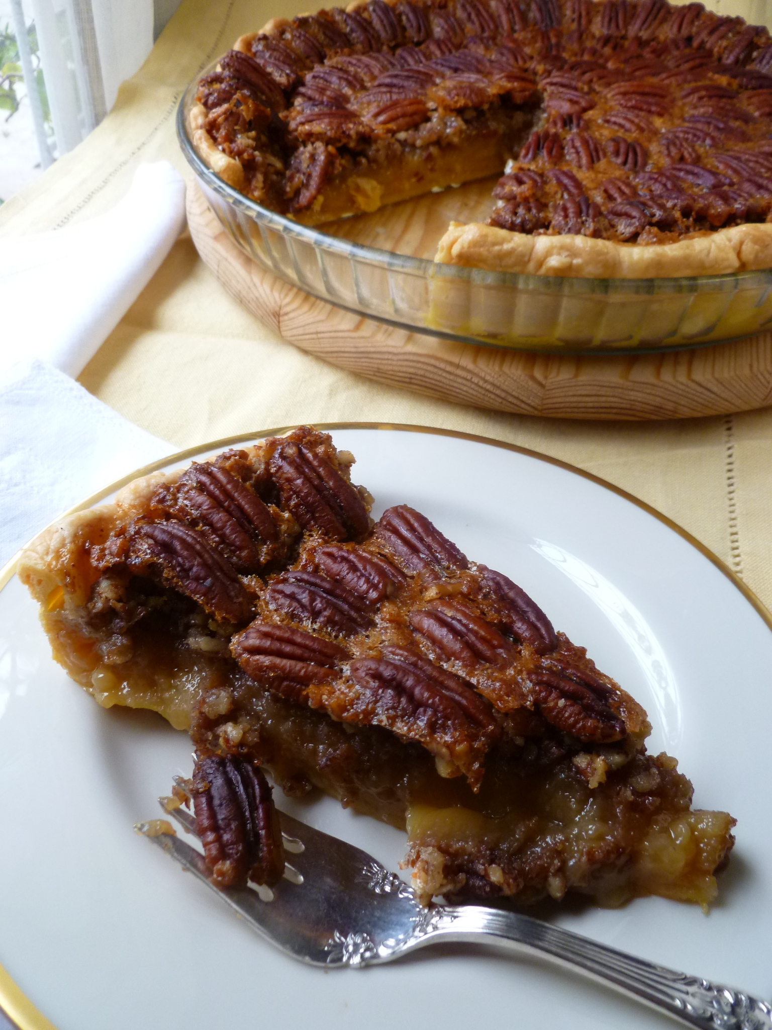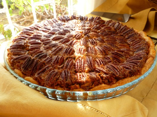 A Suggestion: As with the Baroque pie, this one, too, will slice better if the pie is made a day in advance. Cool it completely, cover the top of the pie with a cotton napkin and a piece of plastic wrap, and refrigerate it overnight. Perhaps the pie is better if it is brought to room temperature before serving…but a cold pecan pie is very good, too.