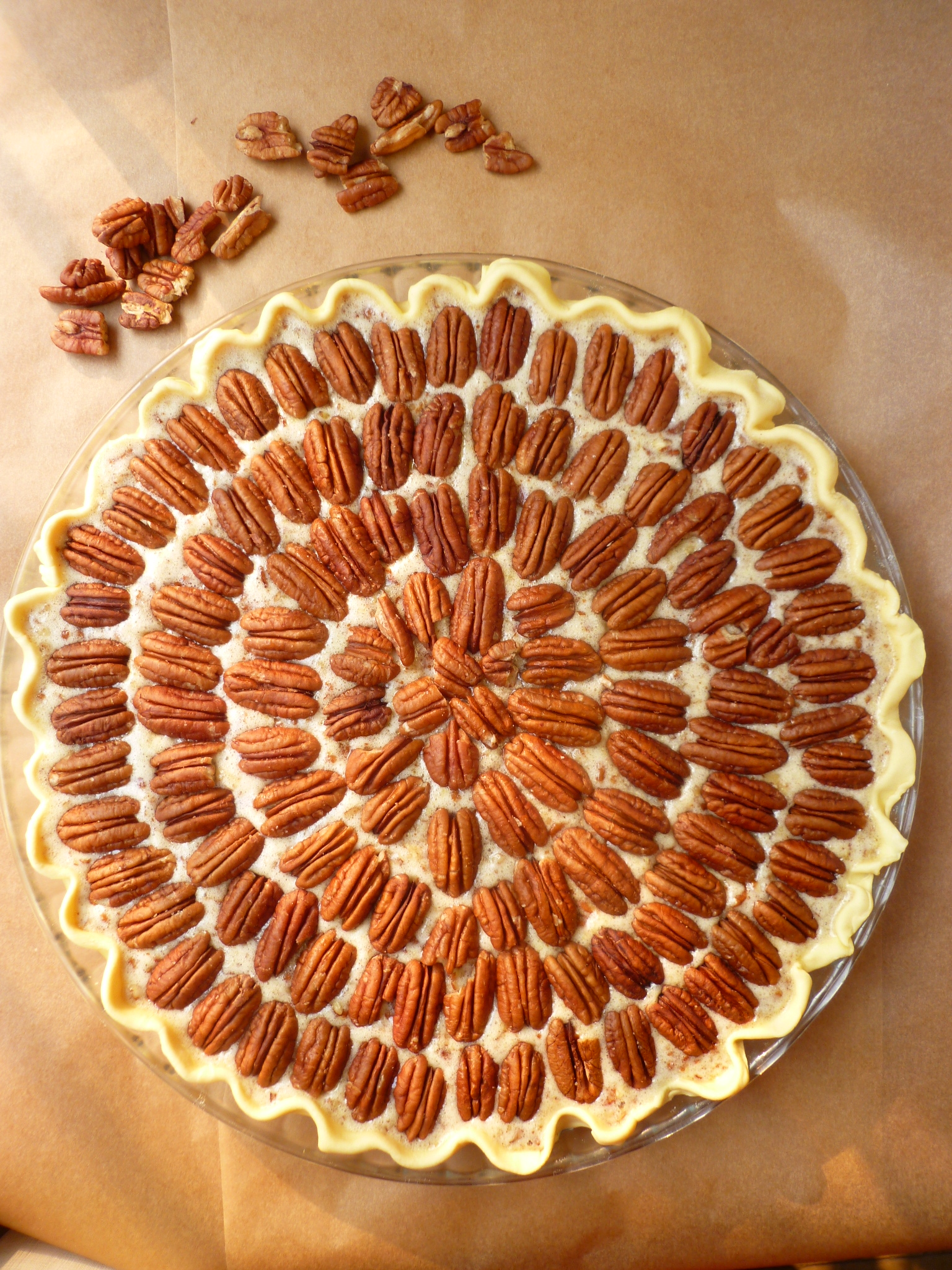 5. Take the pastry shell from the refrigerator and pour the filling into it. Arrange pecan halves in concentric circles on top of the filling…